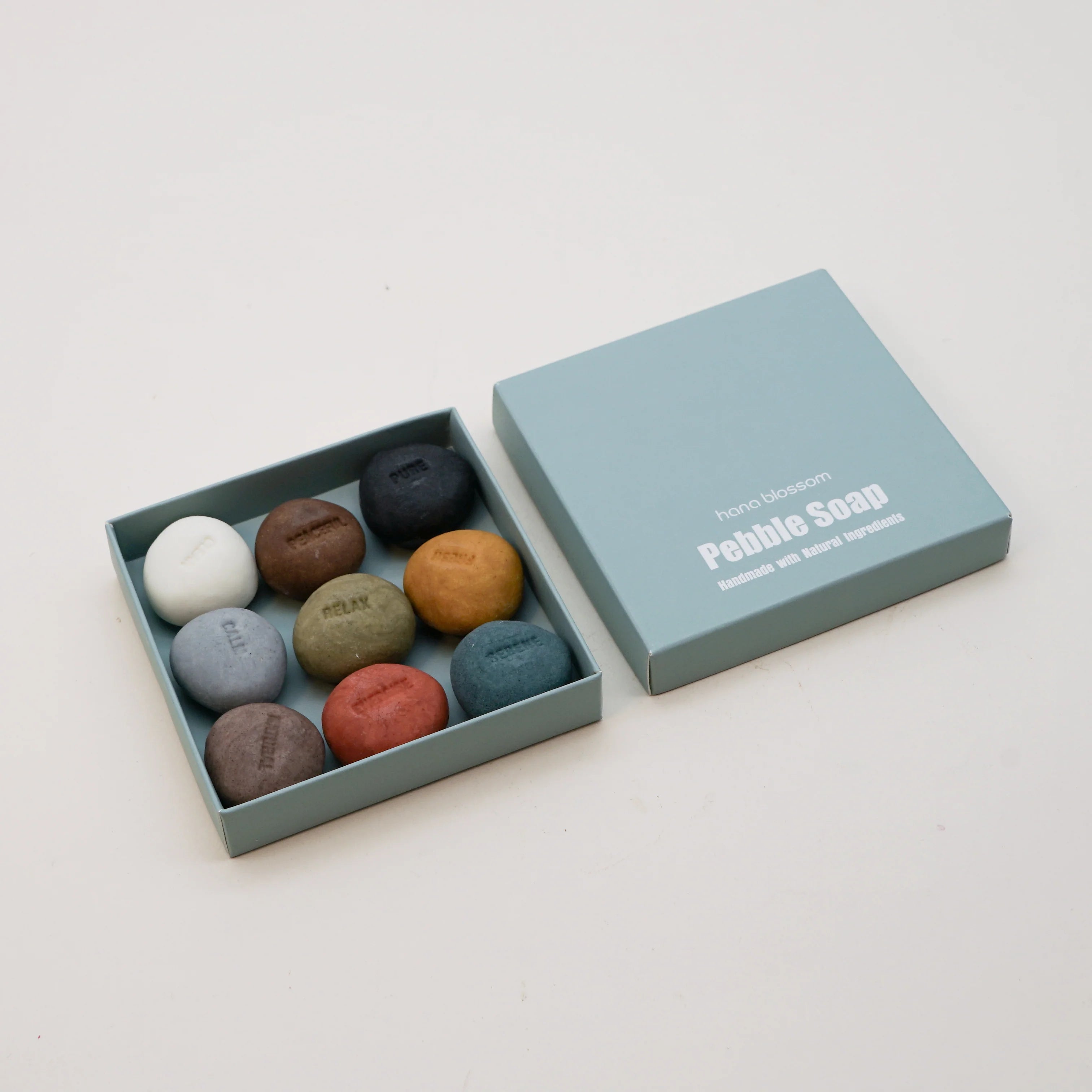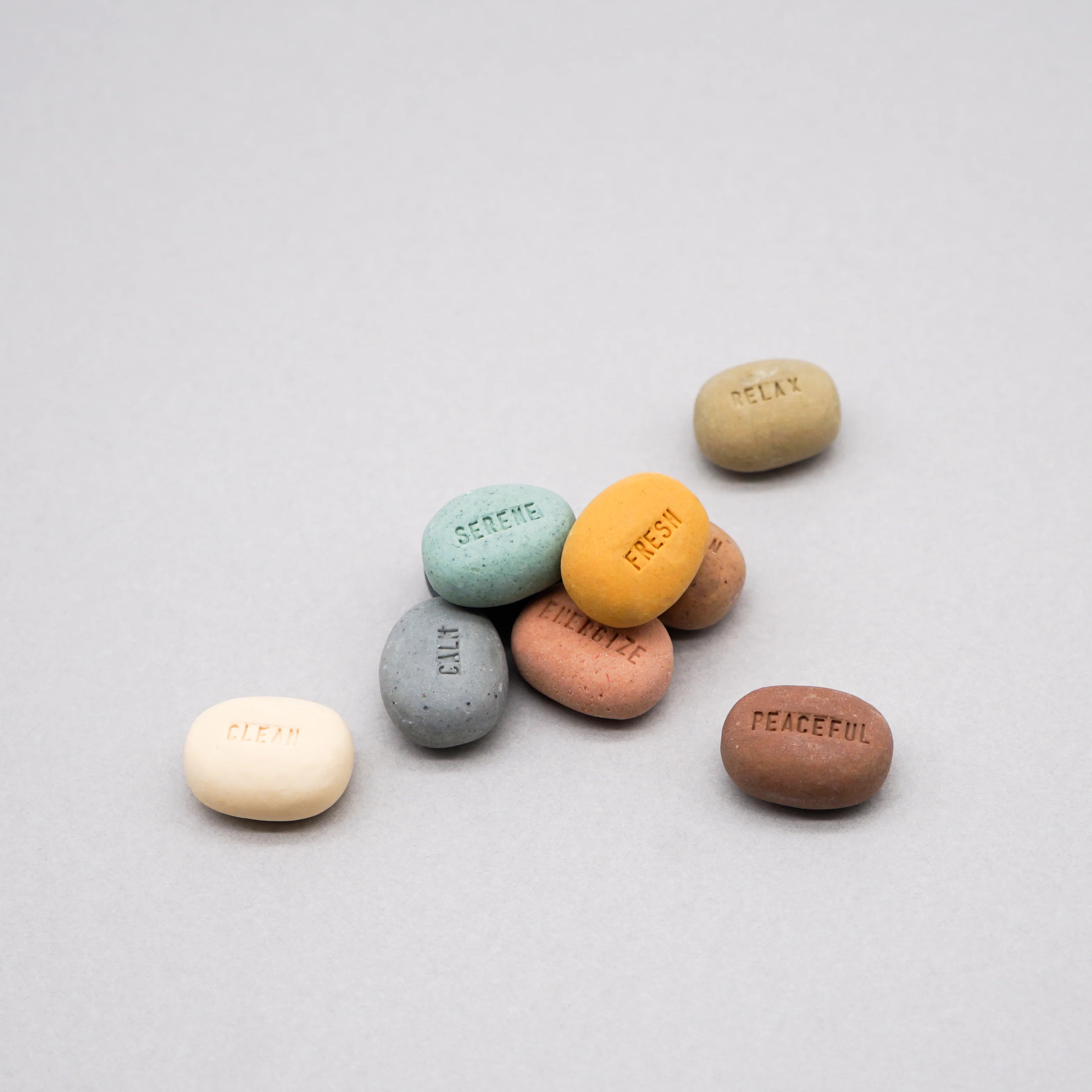 These 9 assorted little pebble soaps are engraved with mood wording such as 'calm', 'fresh', 'serene' and more. They're made with 100% natural ingredients and are vegan, cruelty free and eco friendly.