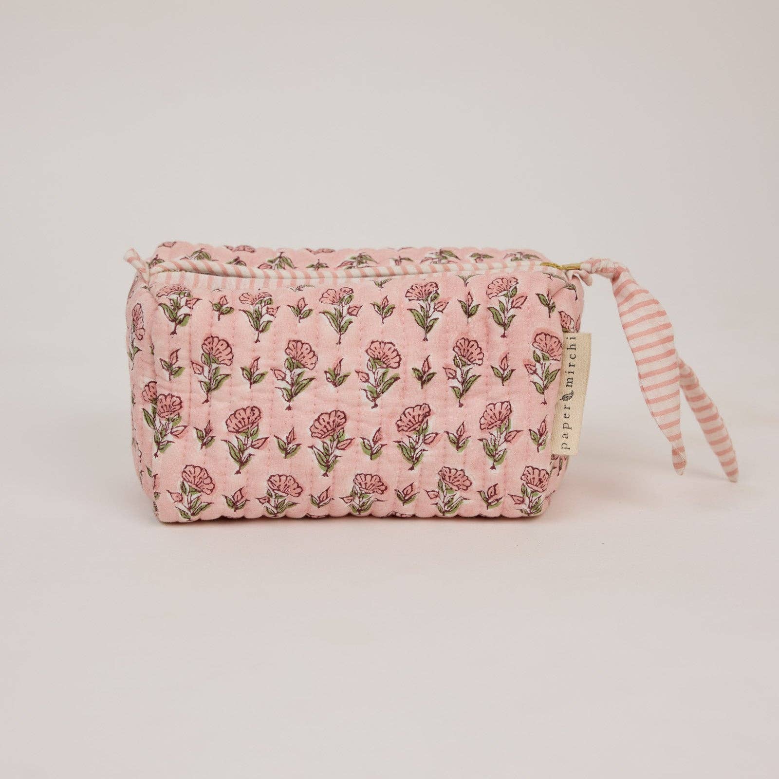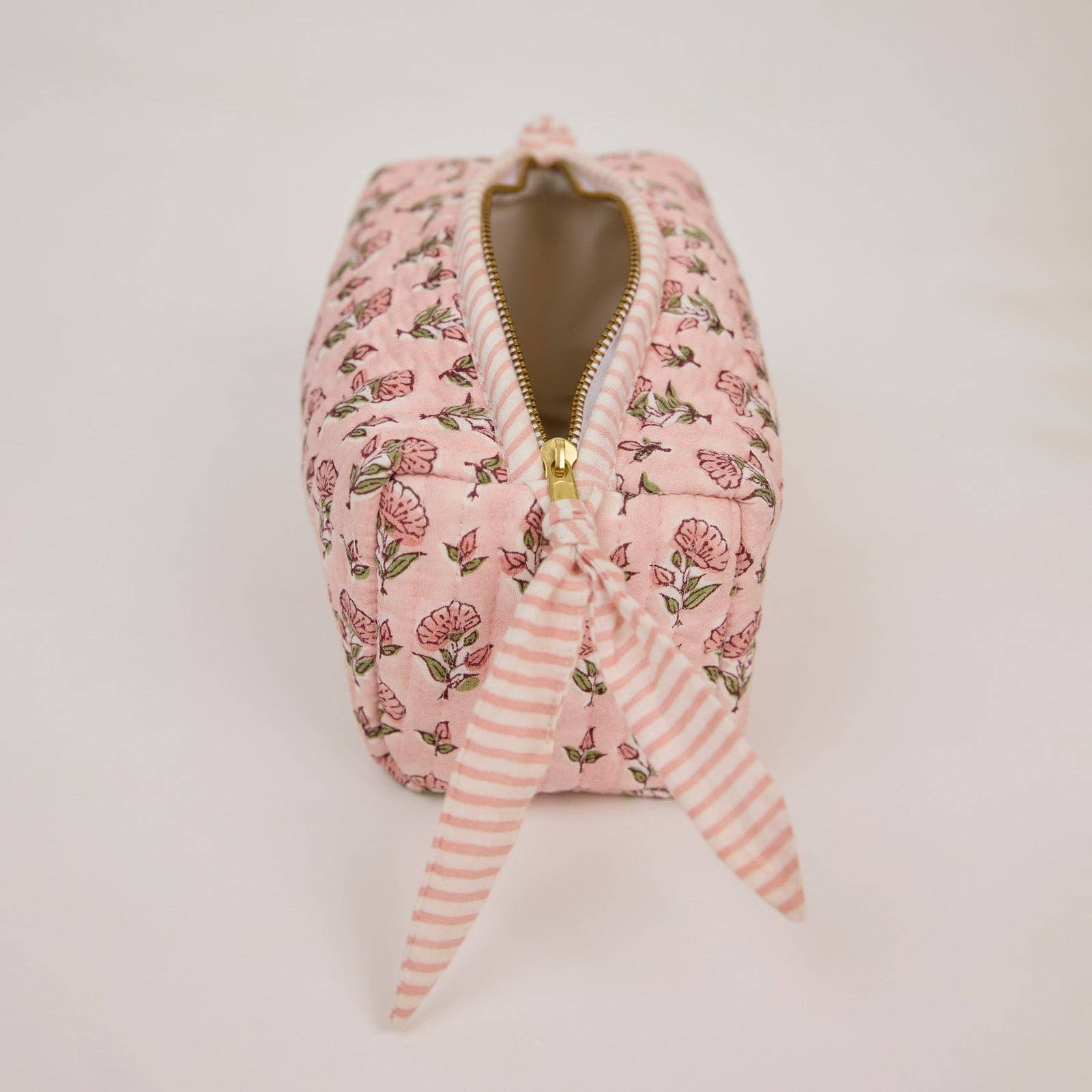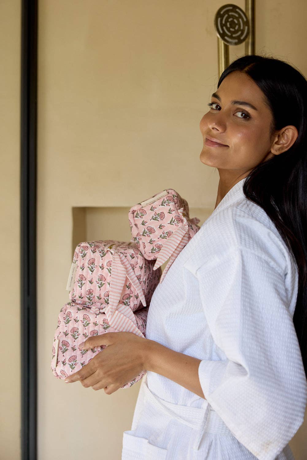 These beautiful cotton toiletry bags are block printed by artisans and handmade in small batches, this quilted wash bag is made using soft luxurious organic cotton.