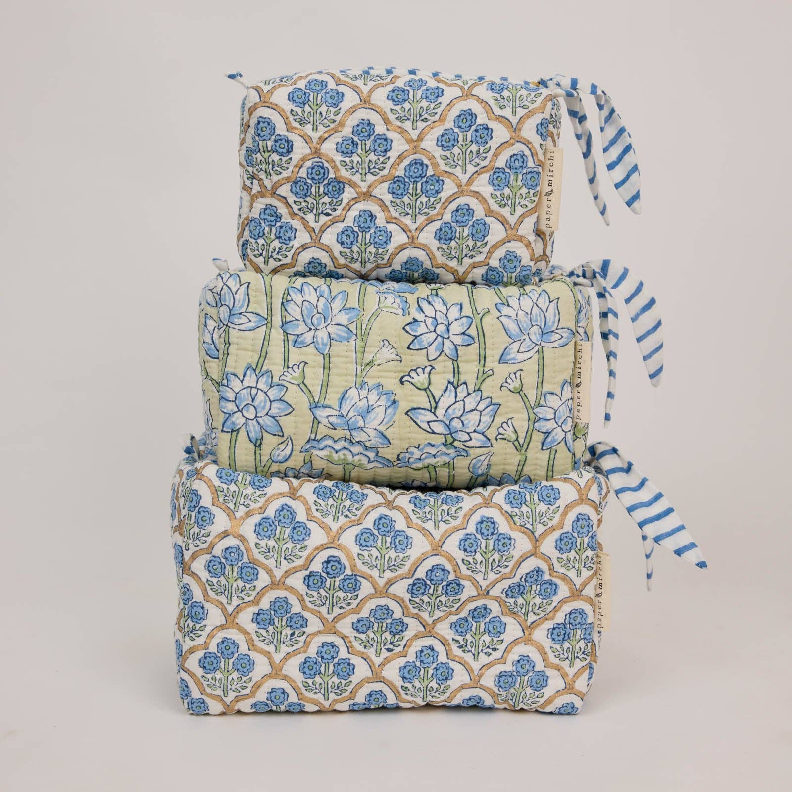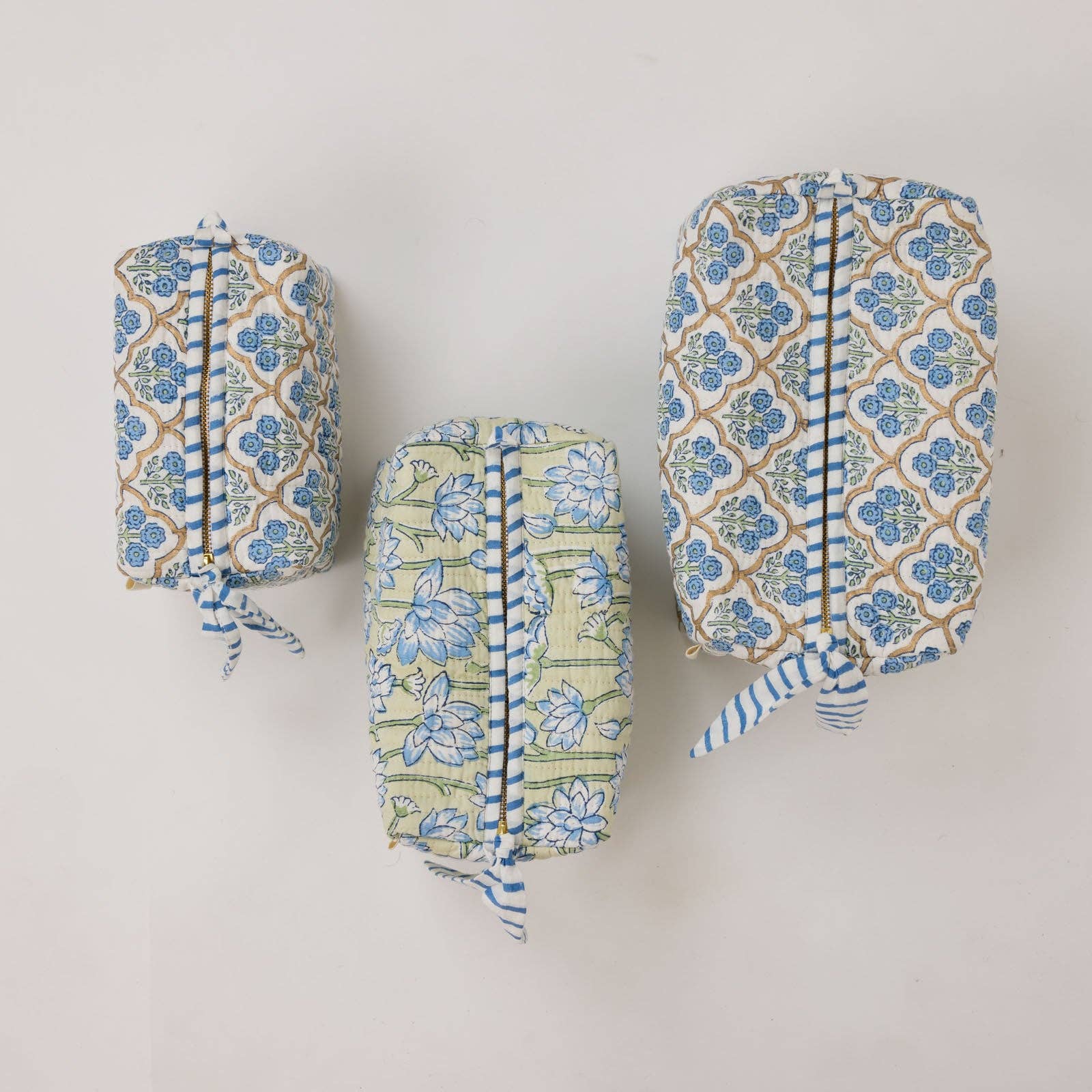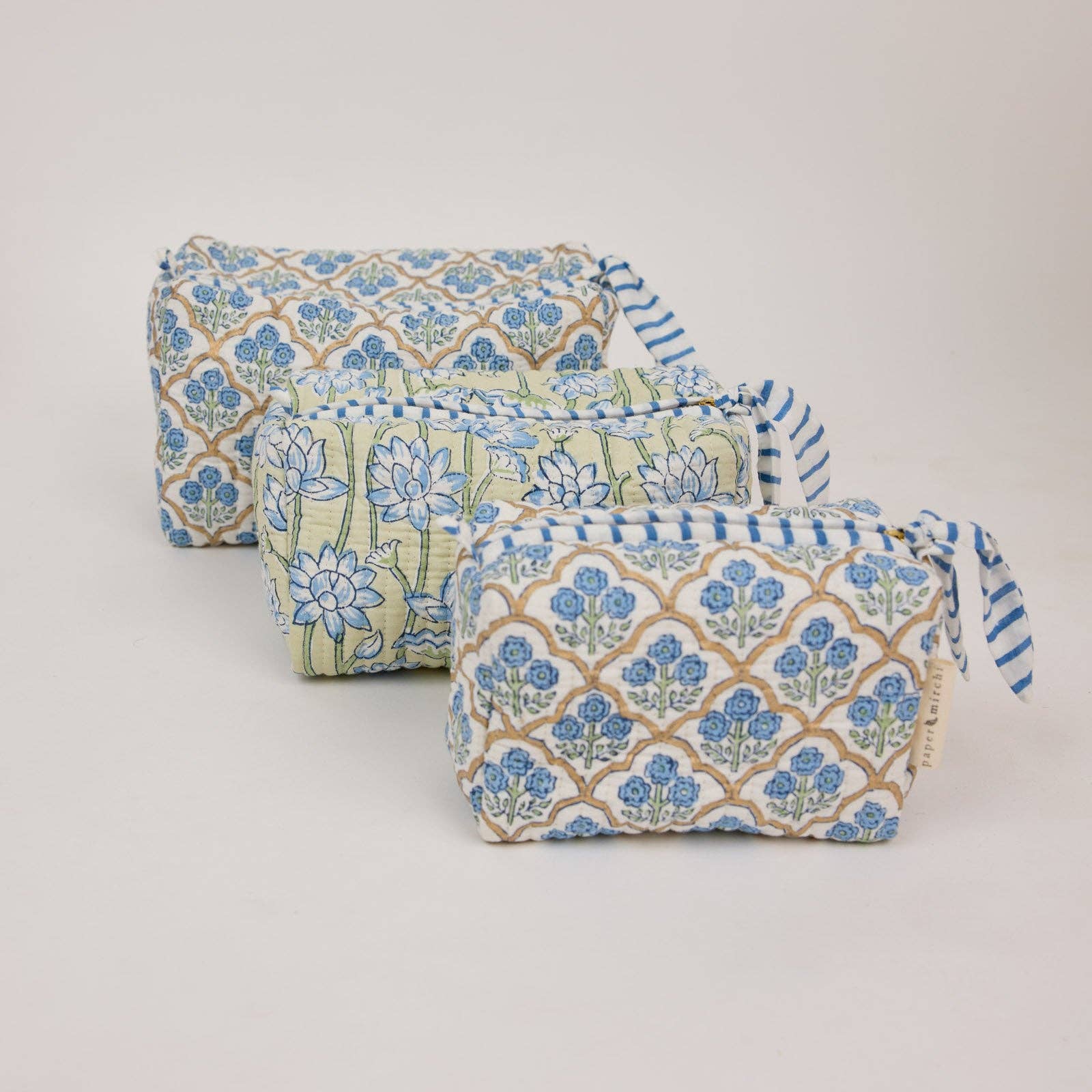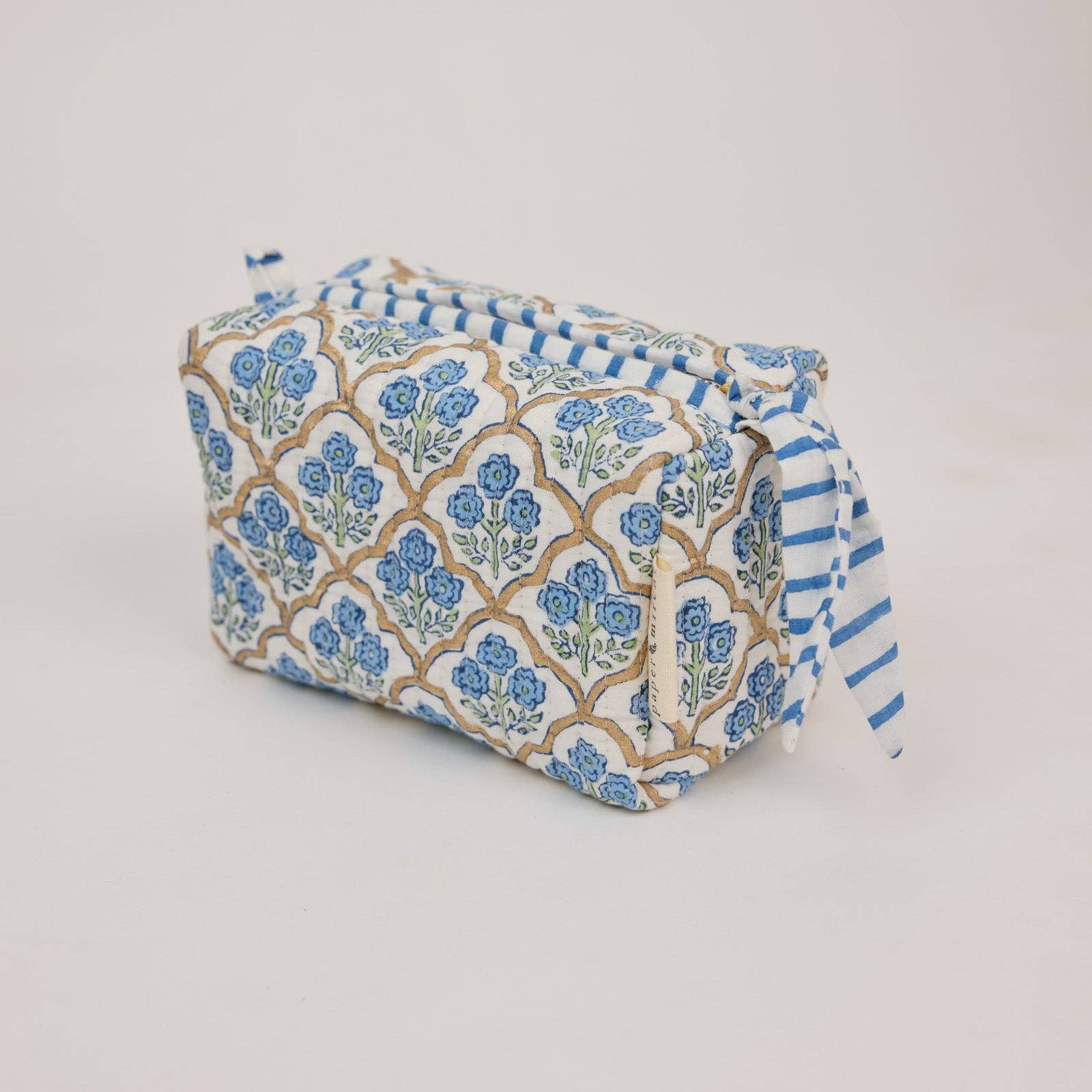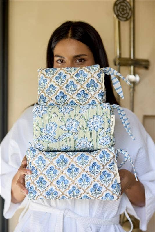 These beautiful cotton toiletry bags are block printed by artisans and handmade in small batches, this quilted wash bag is made using soft luxurious organic cotton.
