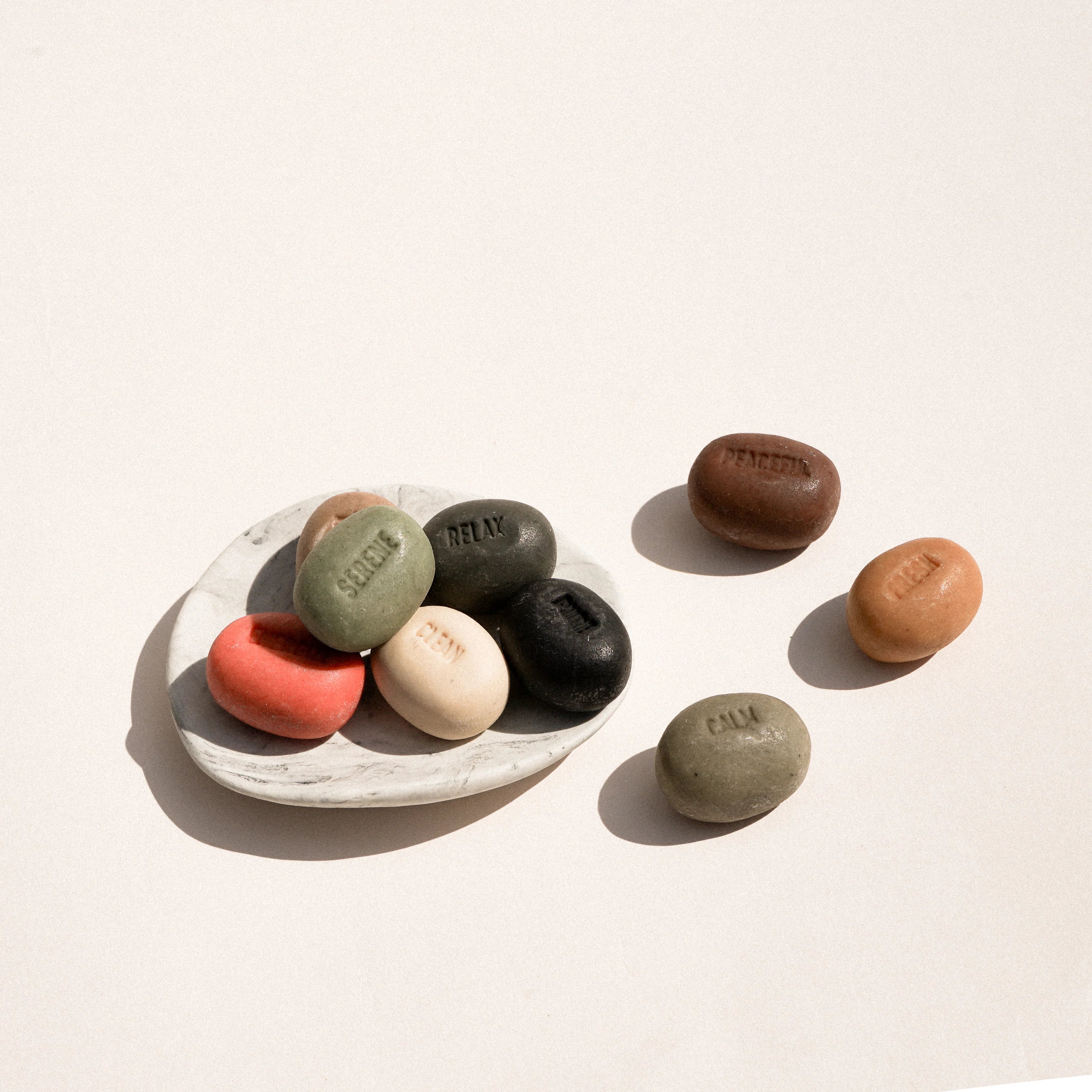 A set of 9 little pebble soaps with a small porcelain dish. The pebble soaps are engraved with mood wording such as 'calm', 'fresh', 'serene', and more. They're made with 100% natural ingredients, are vegan, cruelty free, and eco friendly.