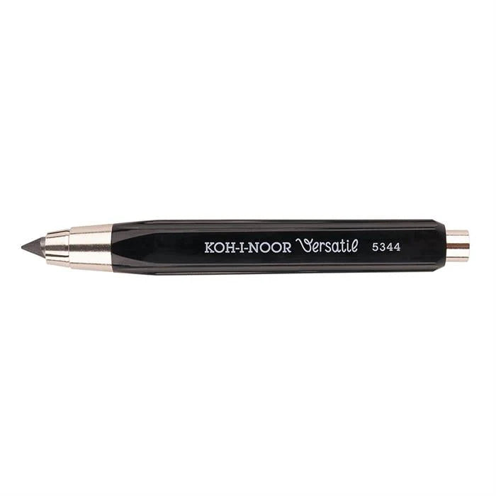 This mechanical propelling pencil from Koh-i-noor comes with a 5.6 mm 4B (soft) graphite lead, for common writing and drawing. The lead is moved by pressing the knob in leaned pencil position, which opens the clamp and the lead is slid out. There is a sharpener in the knob and the lead can be sharpened after screwing the sharpener out.