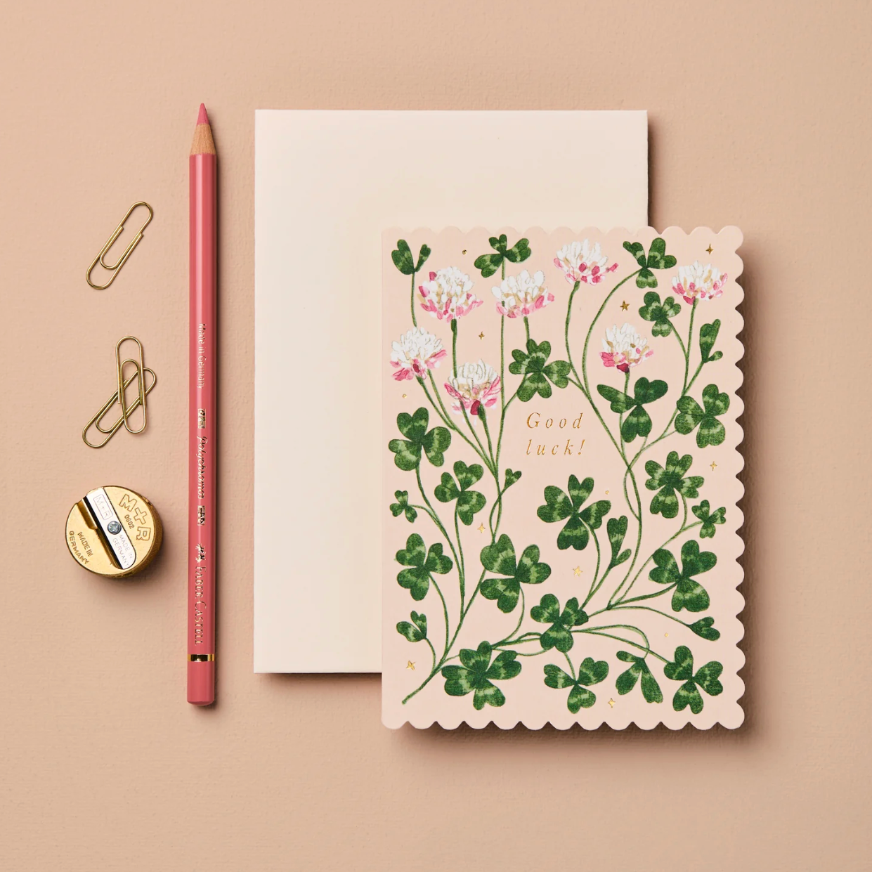 Botanical illustration of lucky clovers and a background dotted with tiny gold stars finished with a Wanderlust signature scalloped edge. Paired with a luxury pale pink envelope. Designed and packed with care from our studio in Hove, England.