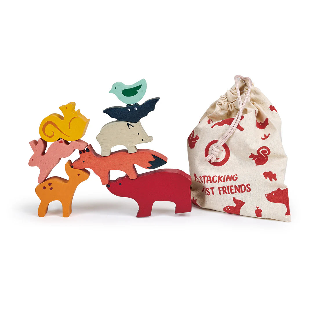 This wooden animal stacking toy includes a running rabbit, a wild boar, a squirrel, a fox, a bear, a deer, a bat, and a bird. Perfect for little ones!