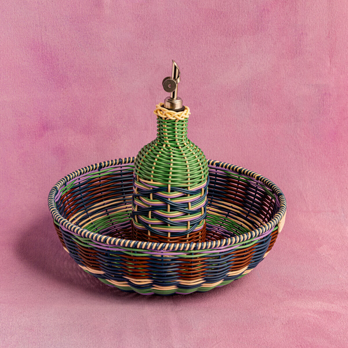 Wrapped in vibrant woven detail, this glass oil pourer, created by Maegan, turns a kitchen essential into a statement piece. Practical and easy to use with its stainless steel spout, it’s designed for smooth pouring at the table or while cooking. Durable, eye-catching, and versatile — it’s the kind of piece that looks as good on display as it works in use.