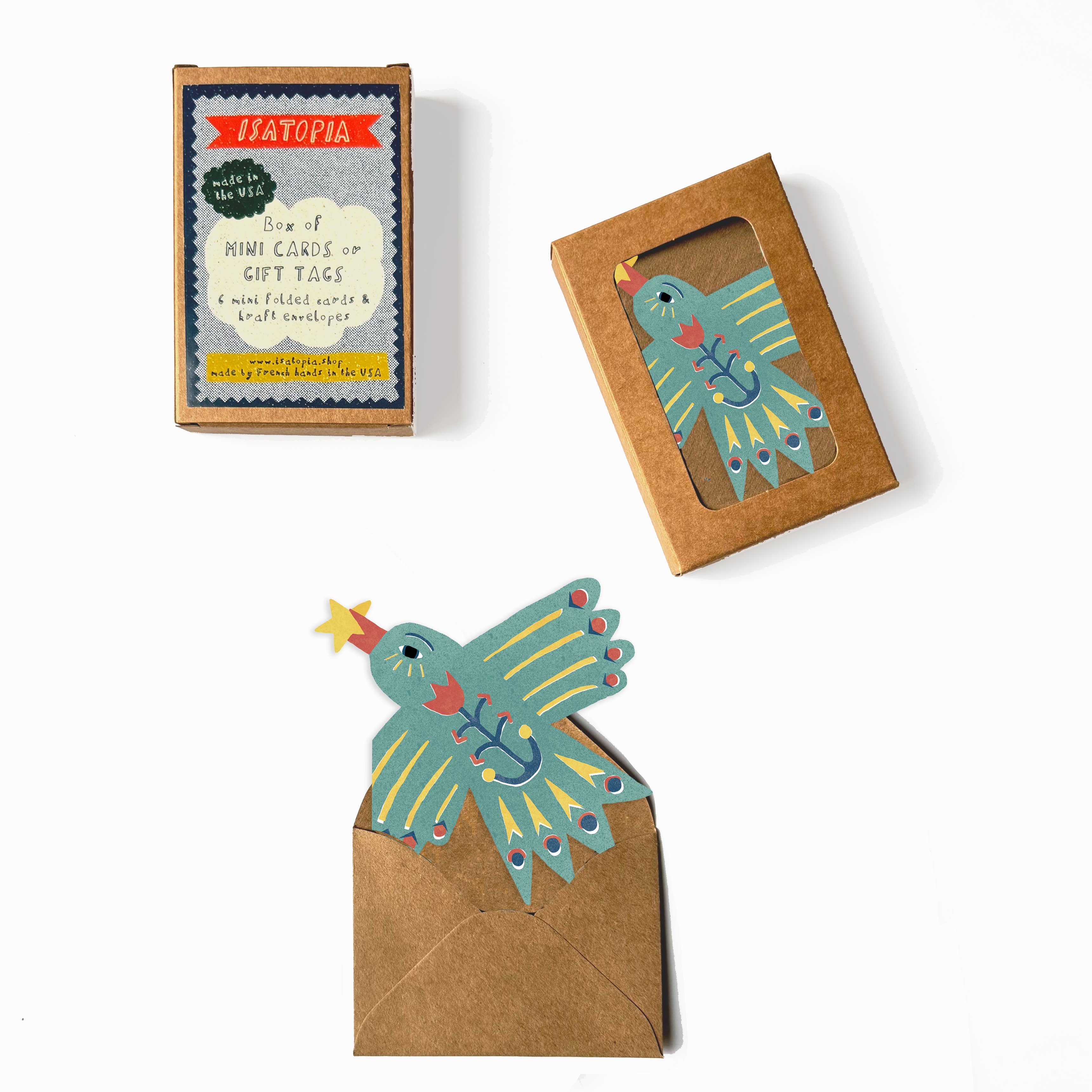 A set of 6 sweet little cards to use as quick notes, or gift labels. Each box has 6 mini folded cards and matching kraft envelopes. Made by French hands in the USA