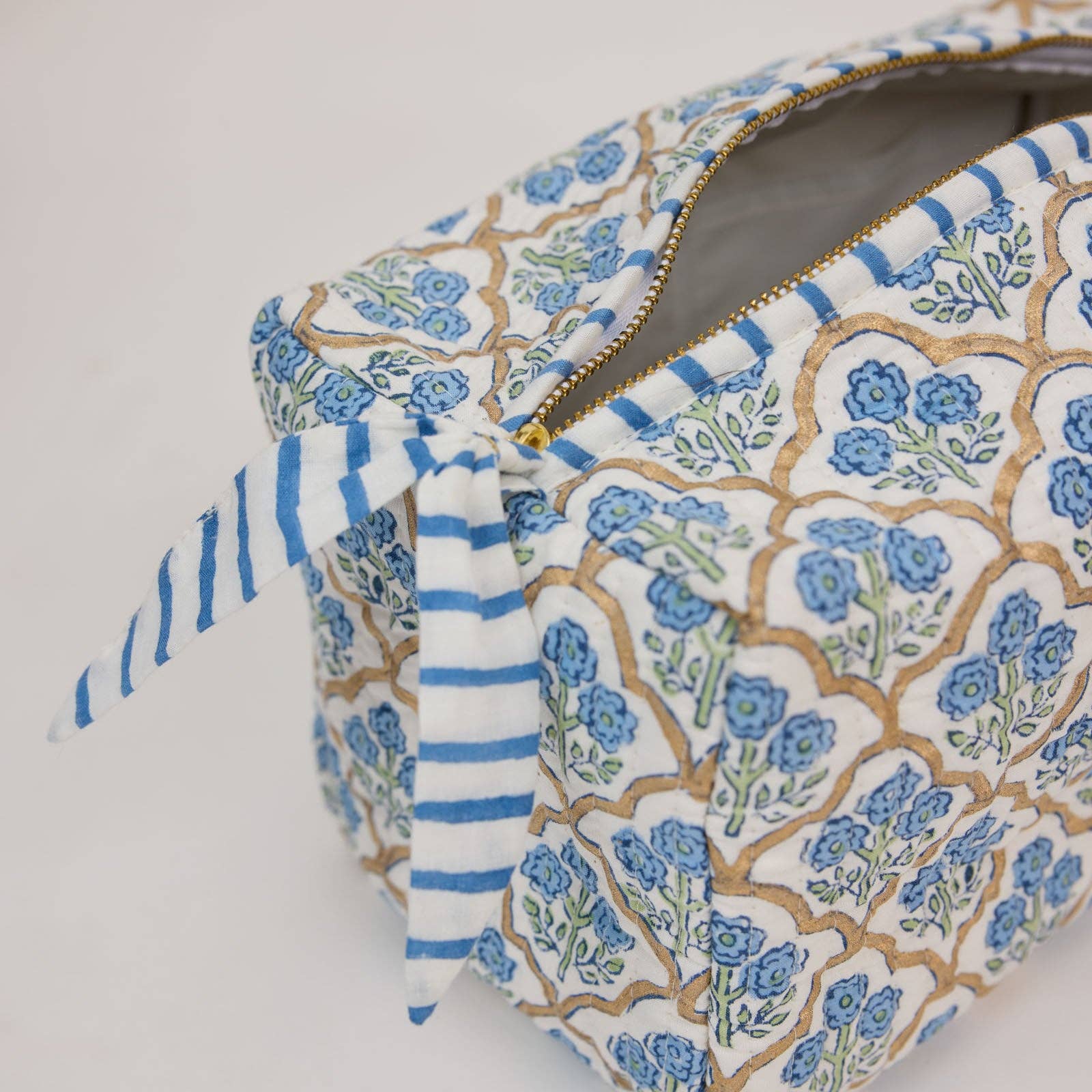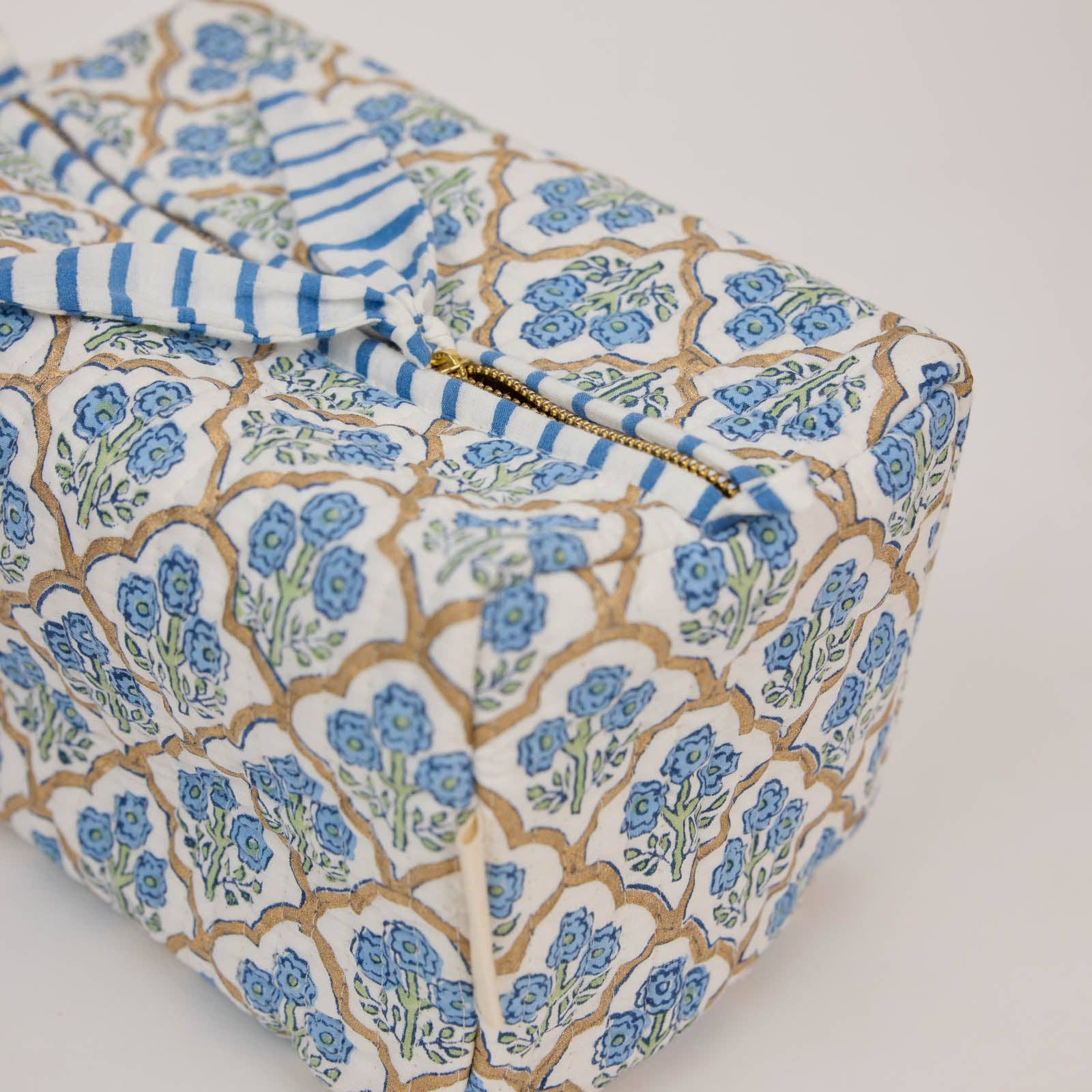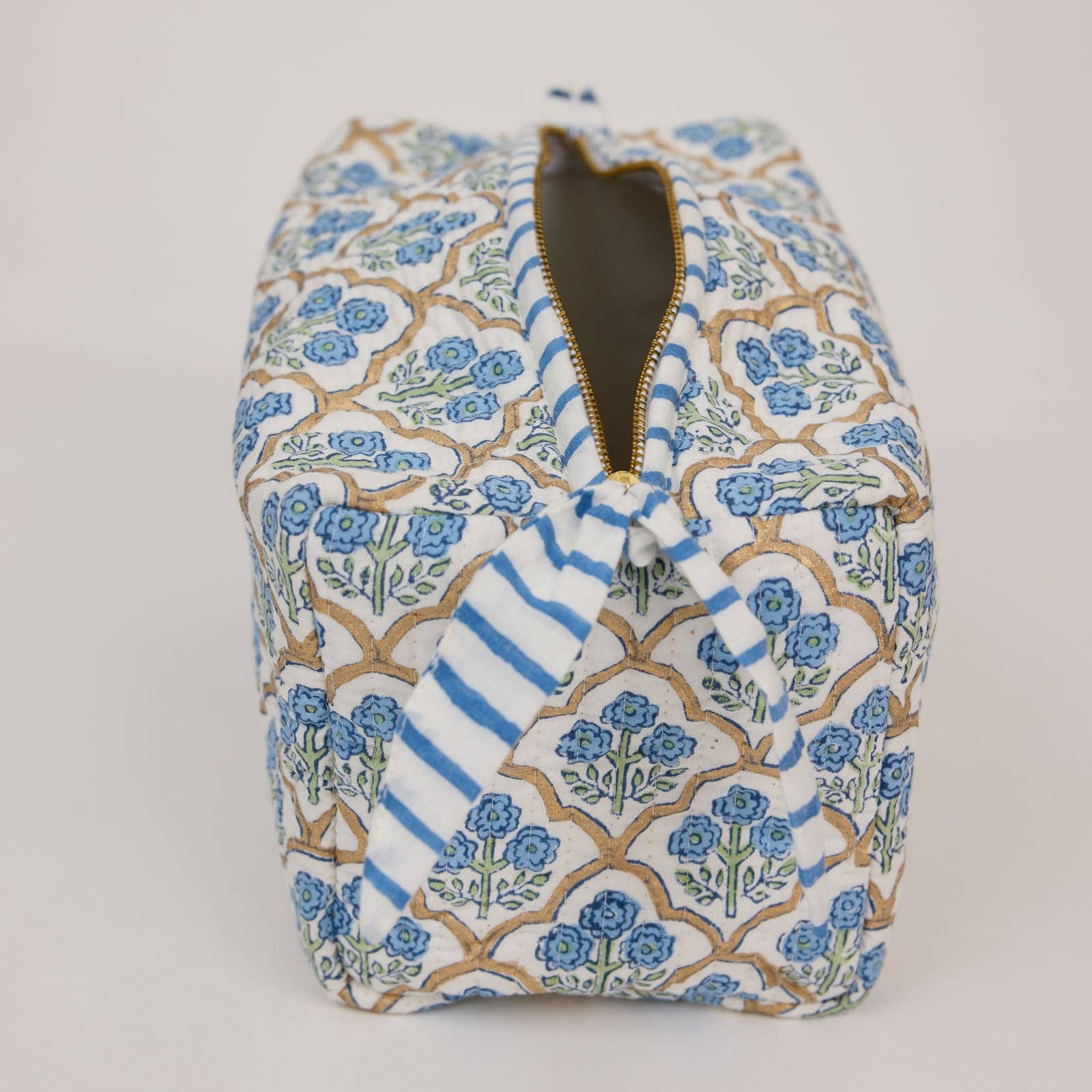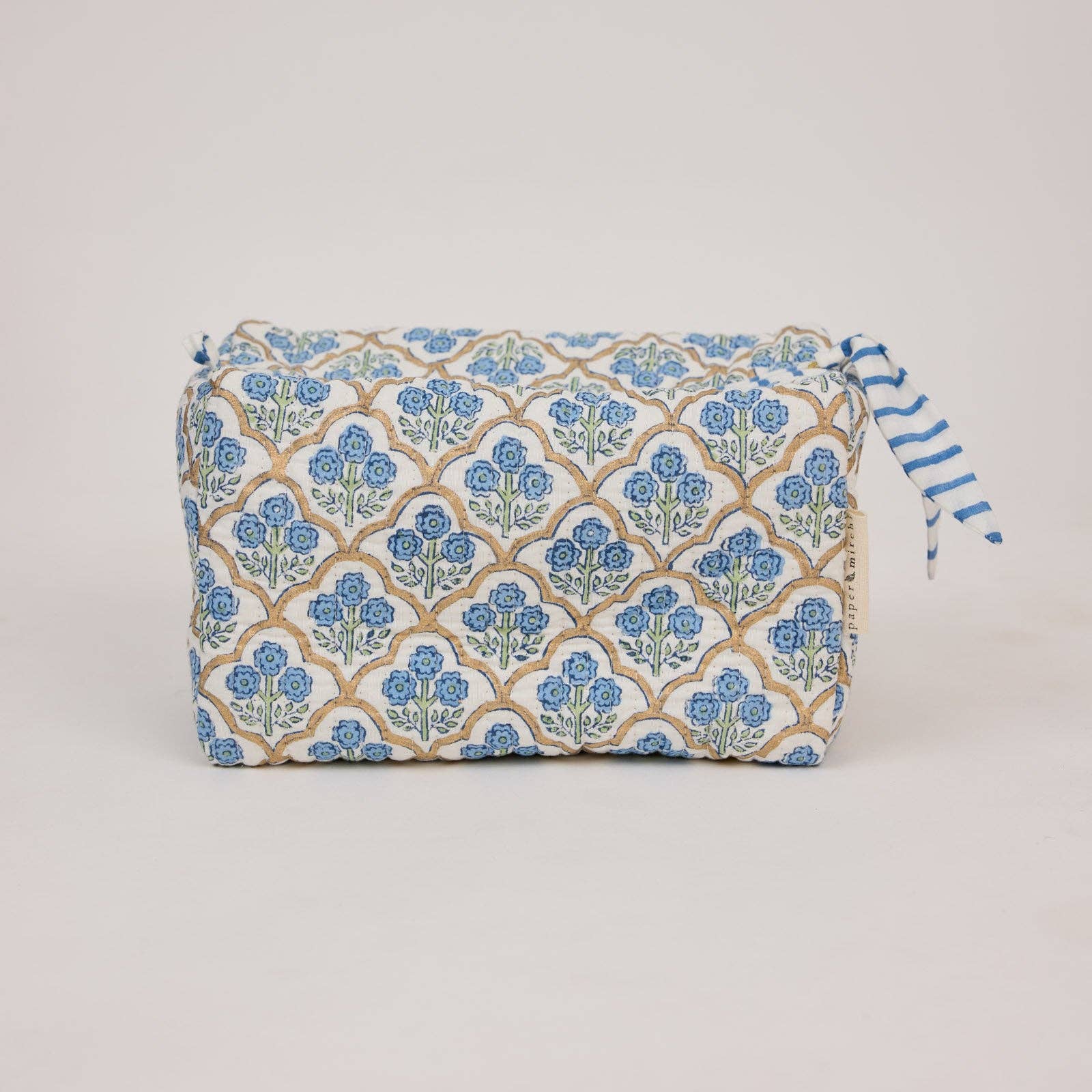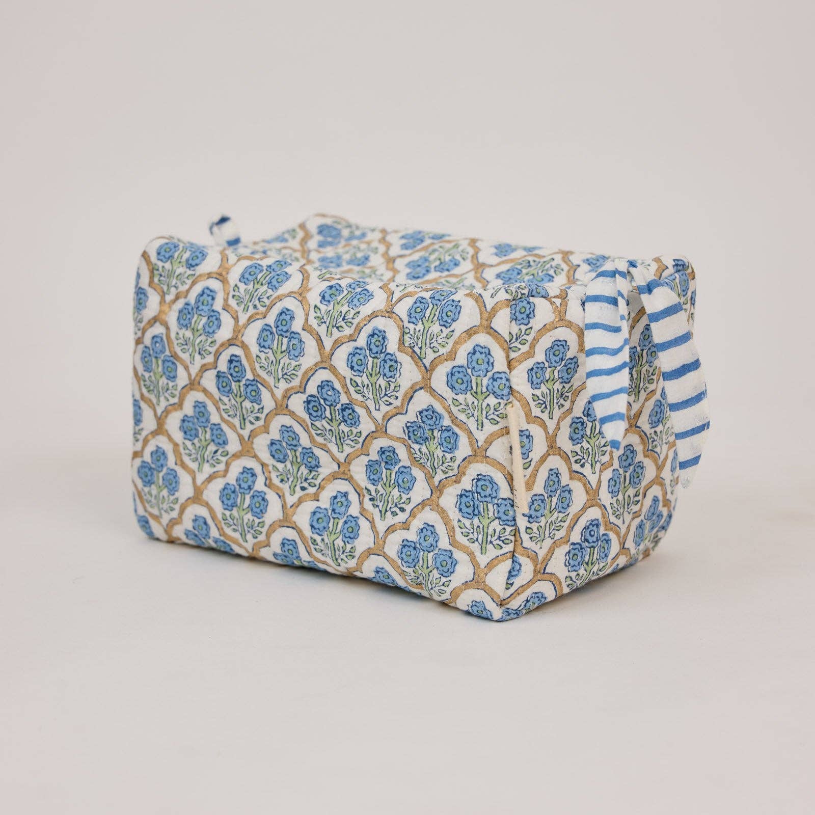 These beautiful cotton toiletry bags are block printed by artisans and handmade in small batches, this quilted wash bag is made using soft luxurious organic cotton.