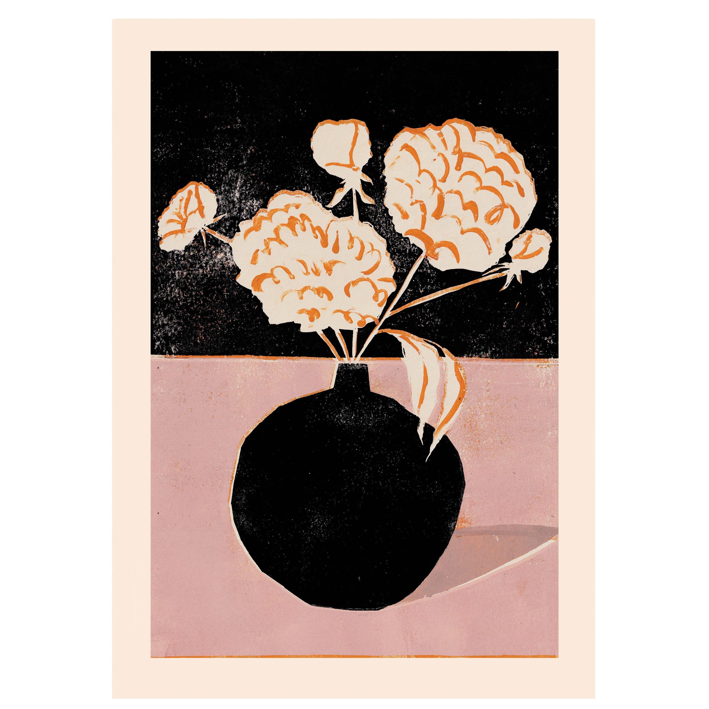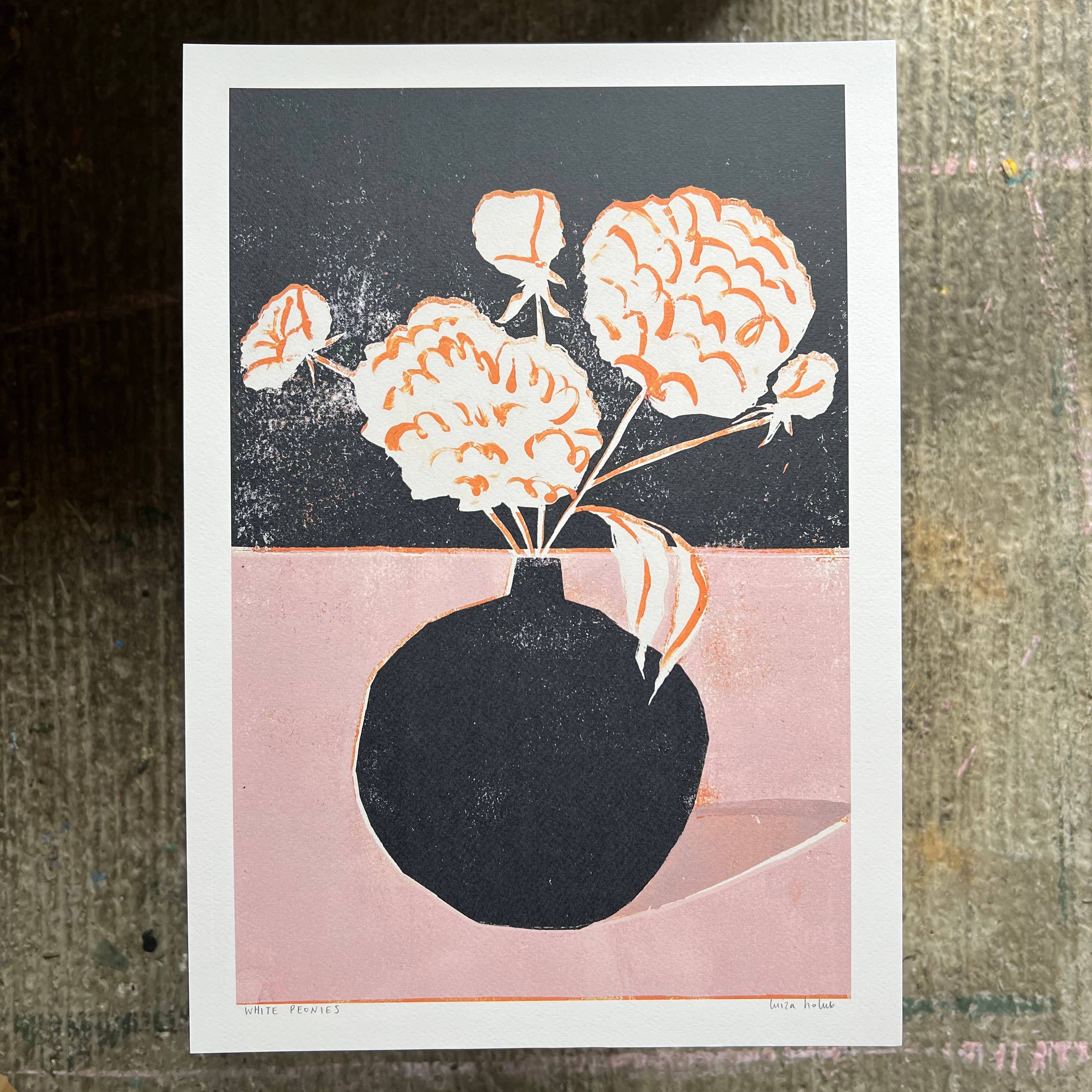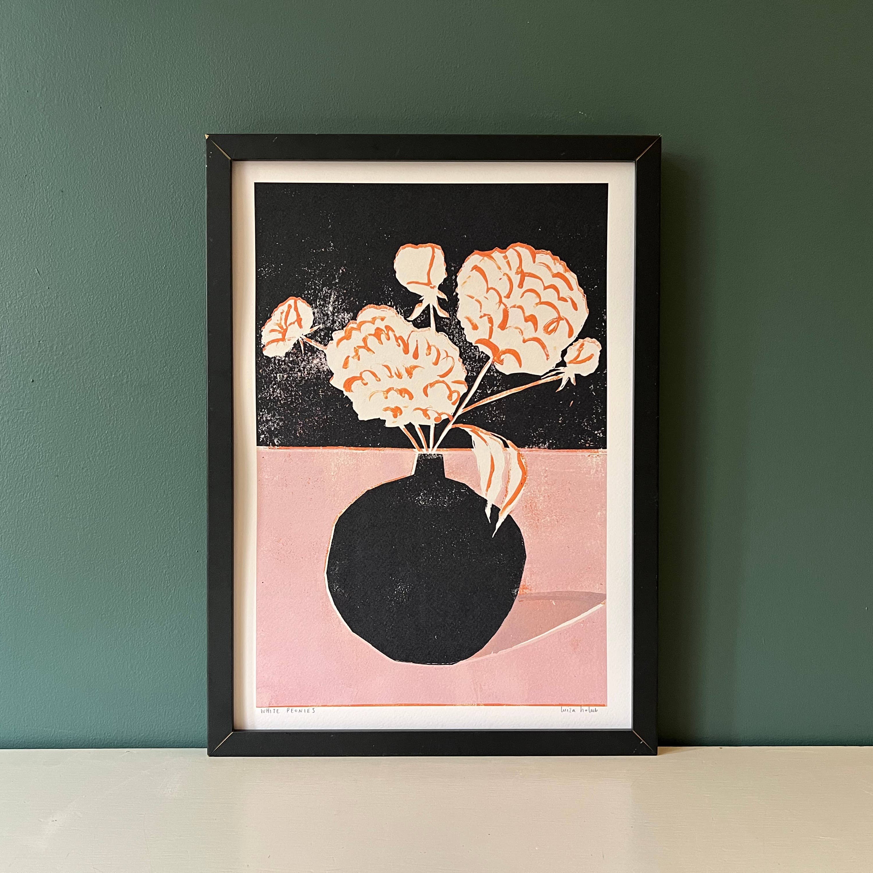 A beautiful print based on original linocut artwork by UK artist Luiza Holub. Featuring a vase of white peonies, this beautiful botanical inspired print is perfect for a living space or bedroom.