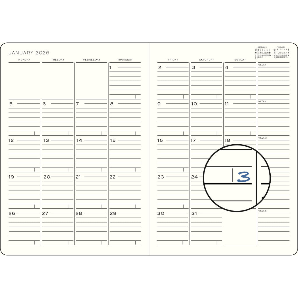 The Monthly Planner & Notebook Composition has a 1st November 2025 start - 28th February 2017 finish (16 Months). With weeks arranged horizontally, one below the other and one full month on a double page spread - this planner includes all the familiar overviews and details you'd expect from a Leuchtturm planner. Also includes a 3 year overview, a project planner, and two bookmarks to help you keep track of key dates and pages.