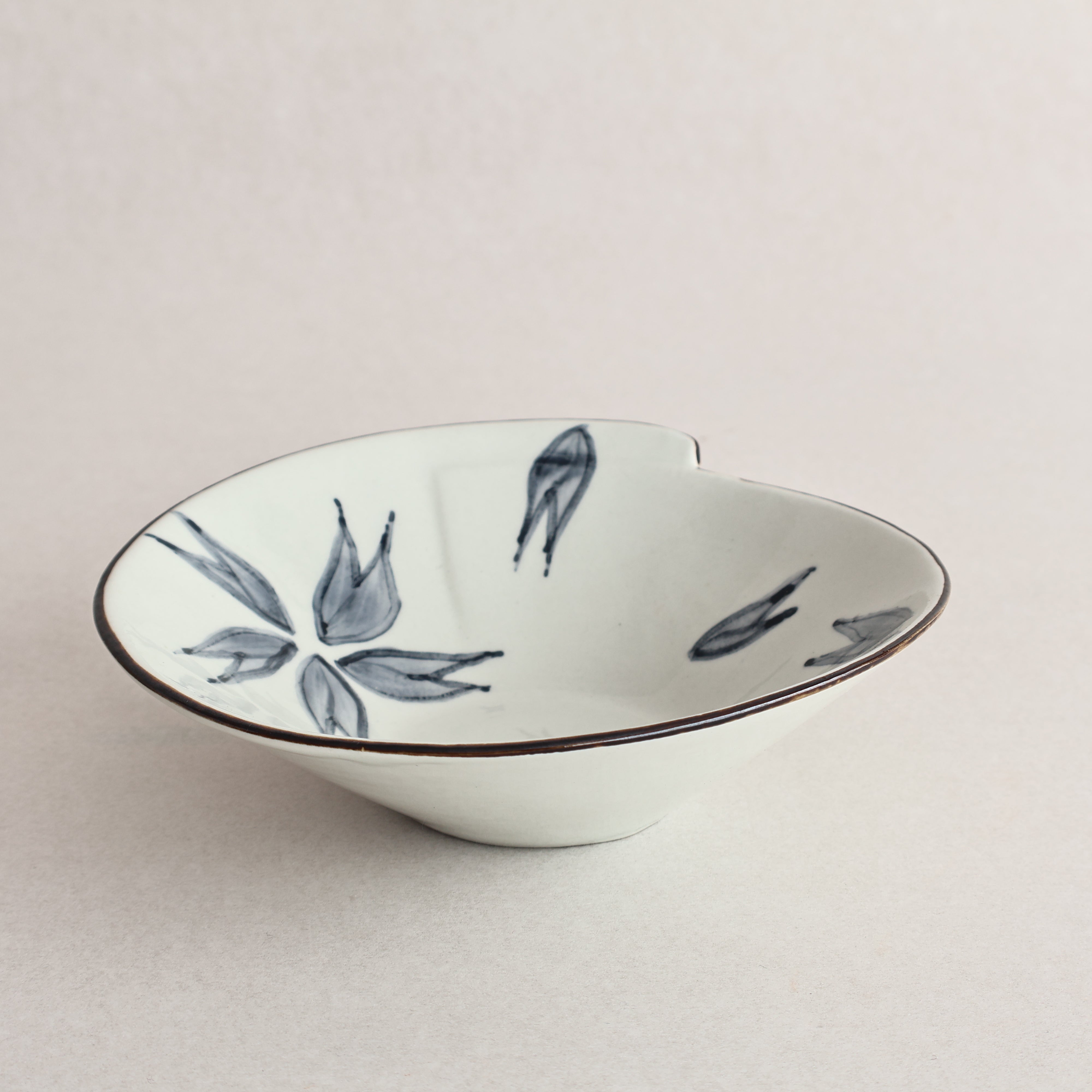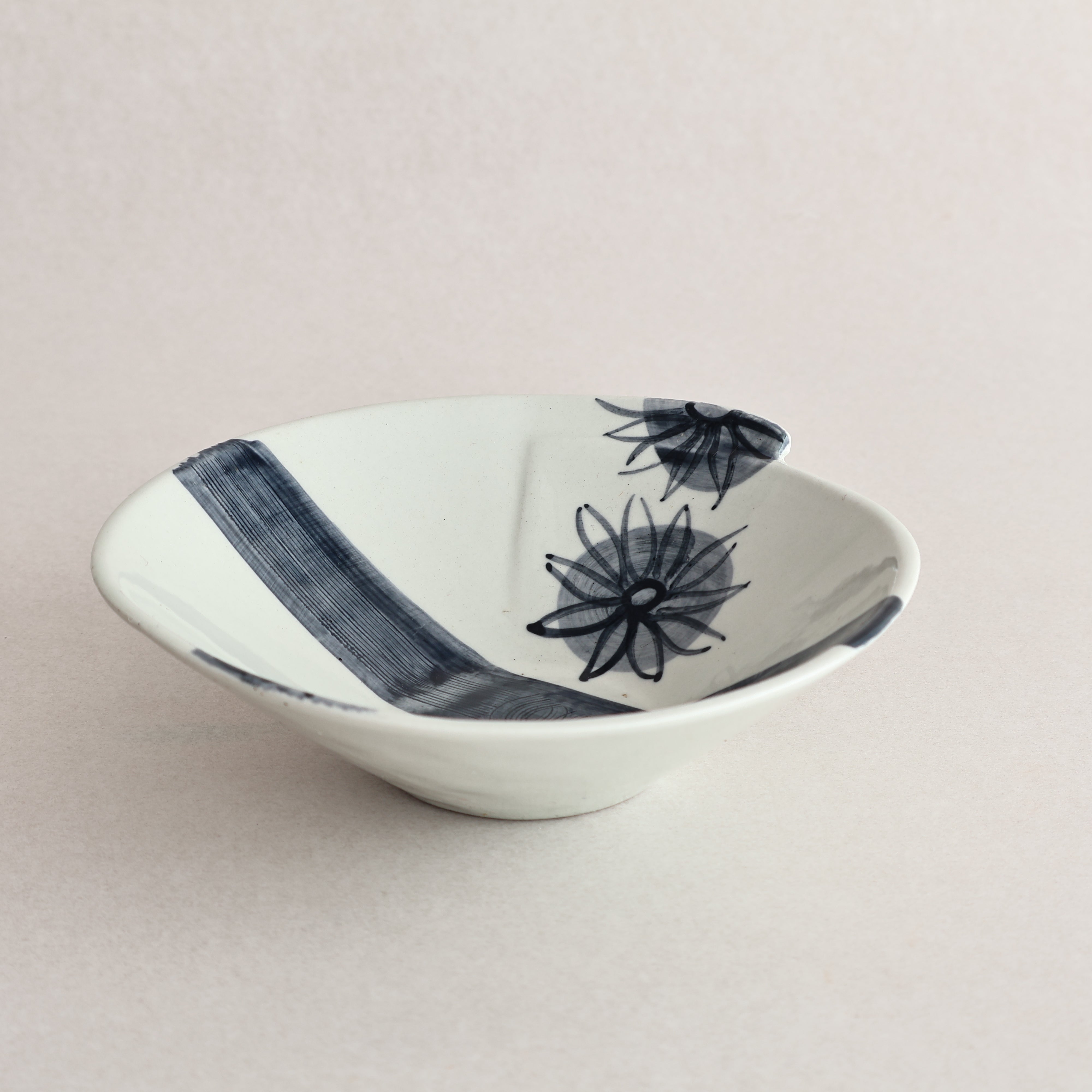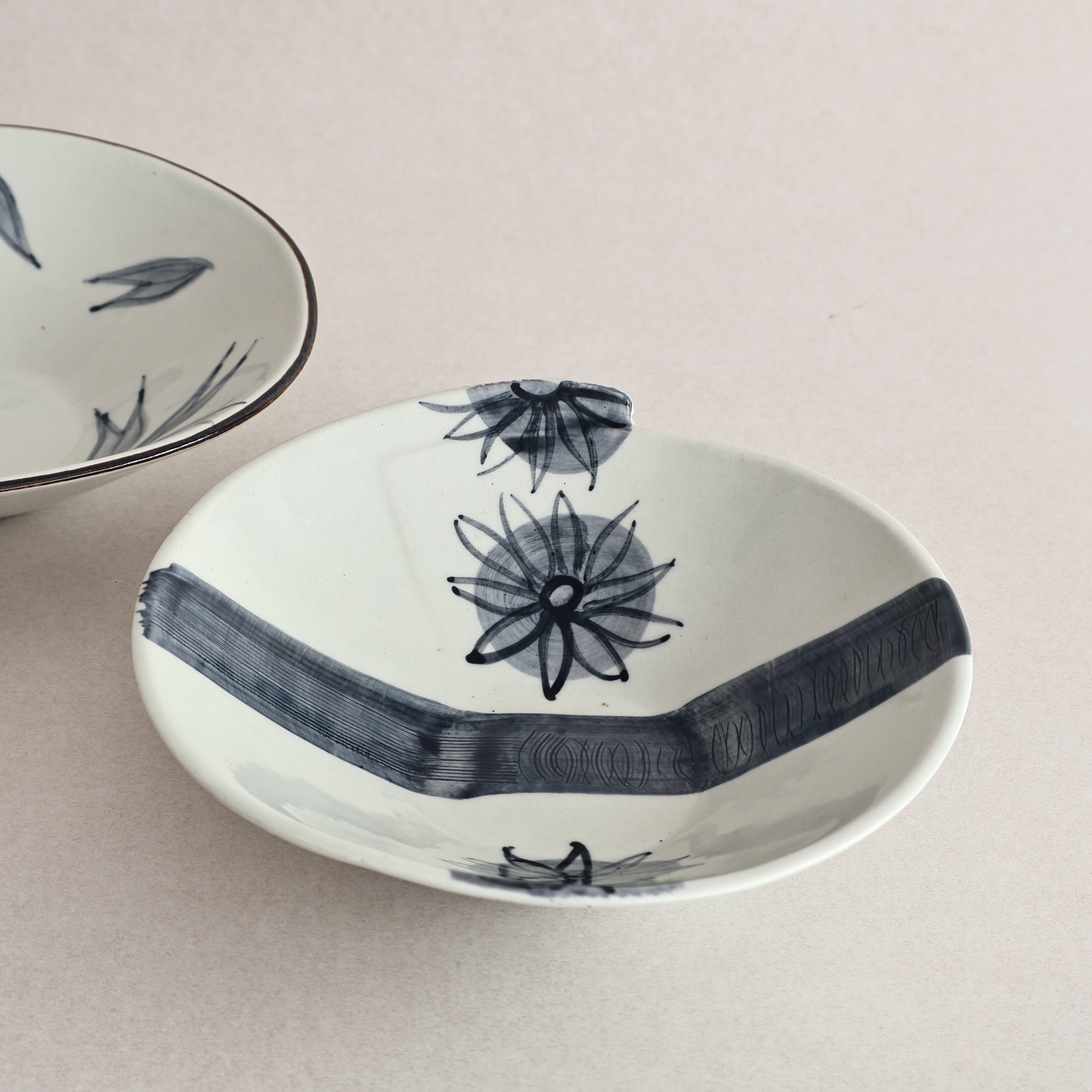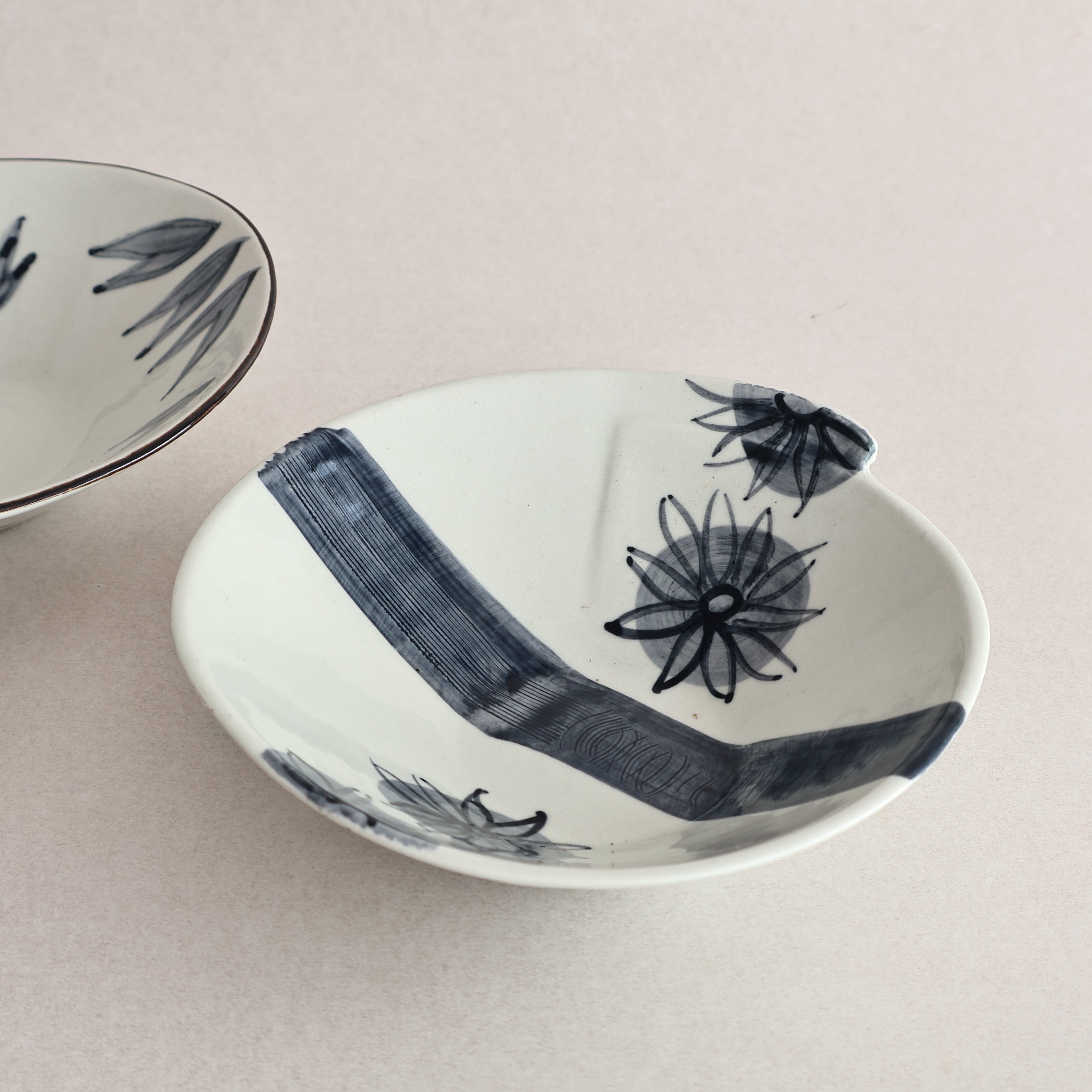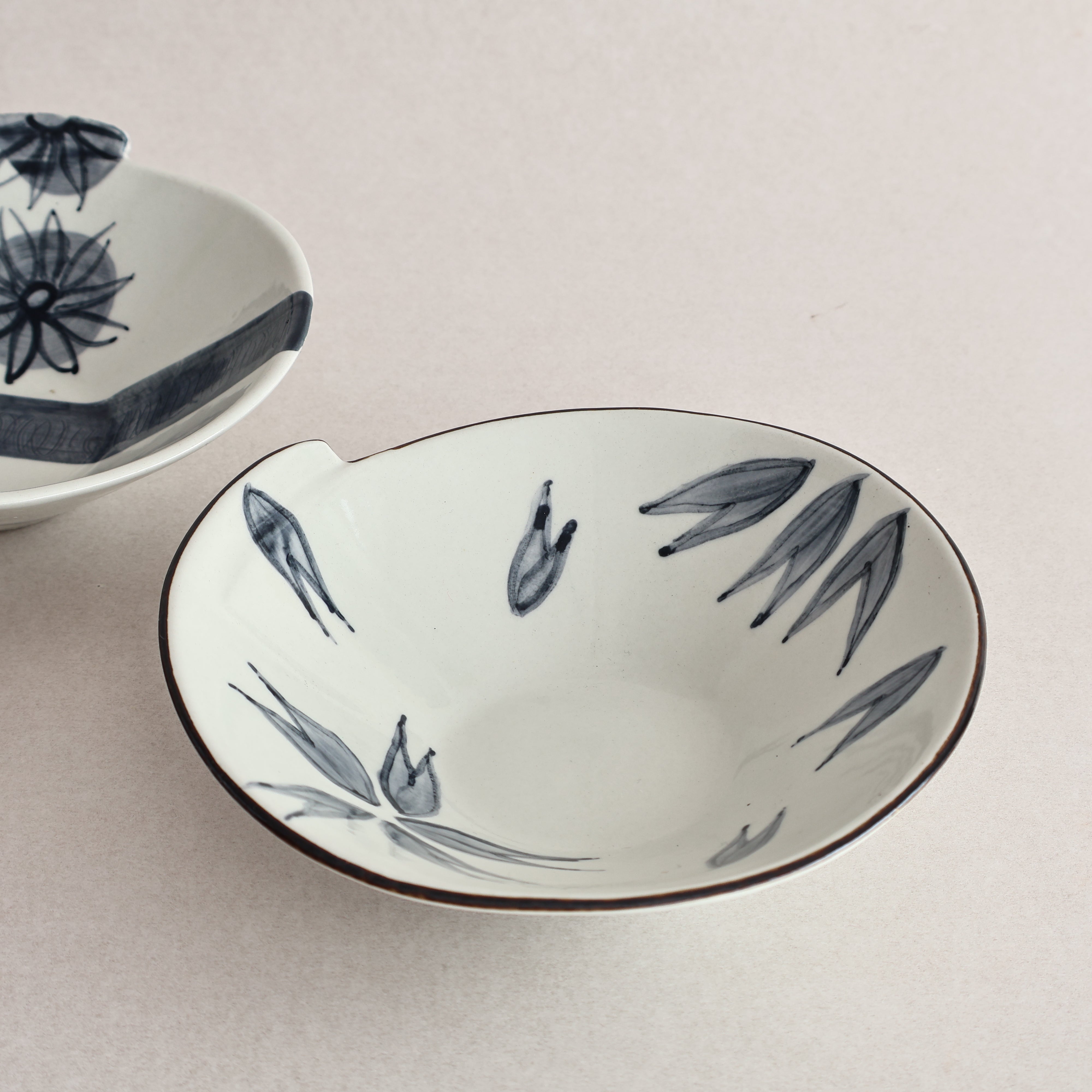 A beautiful example of handpainted ceramics, these delicate ceramic bowls feature a blue hand-painted floral design and an unusual geometric edge.