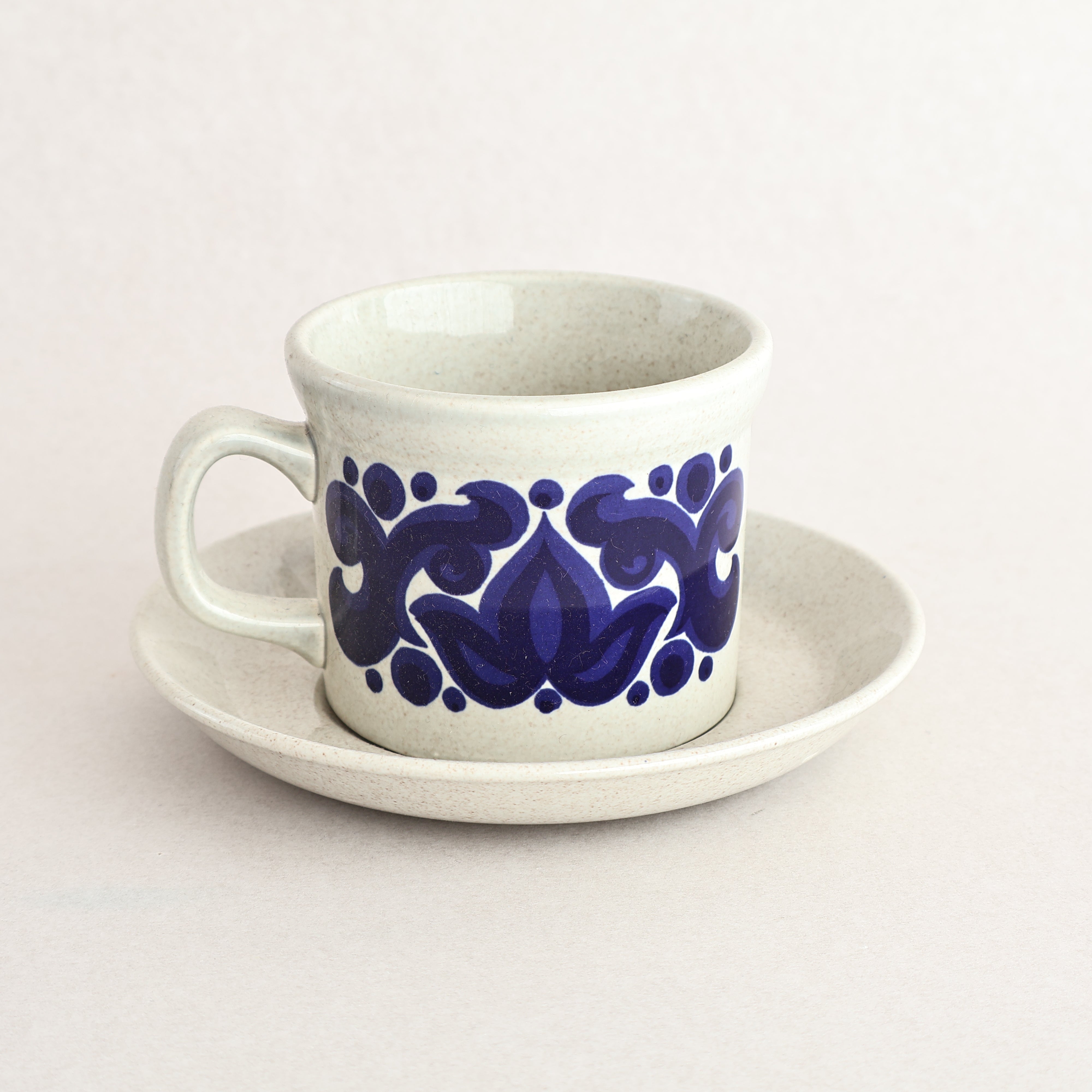 This cup and saucer duo were crafted by Wedgwood in England, during the mid-20th century. Part of their iconic Toledo range, with a cream base and two-toned blue abstract chunky pattern in the center.