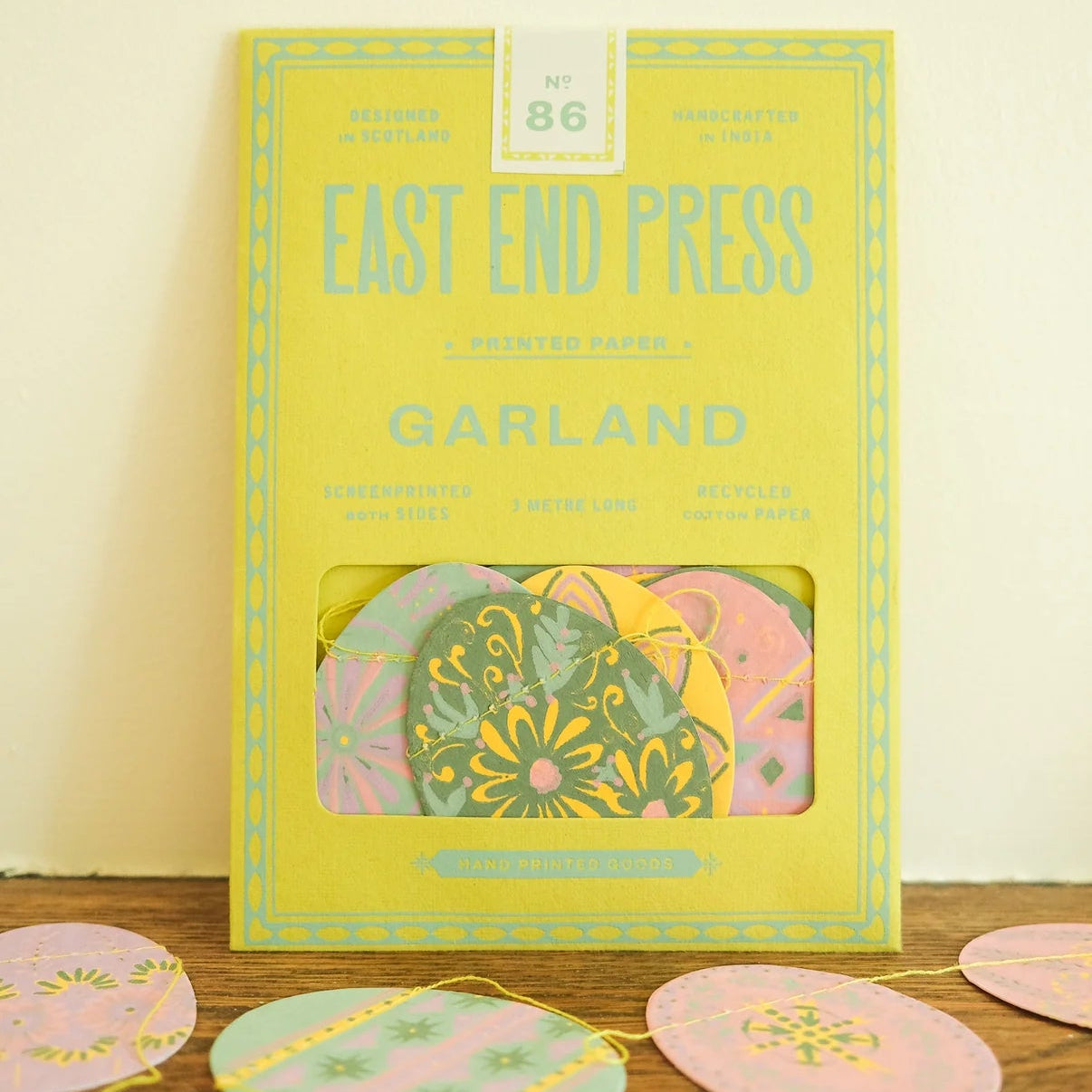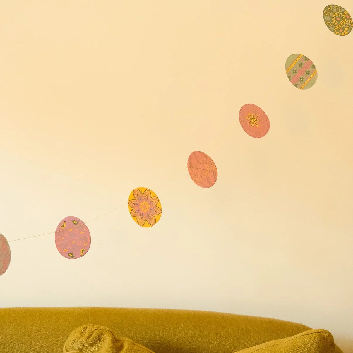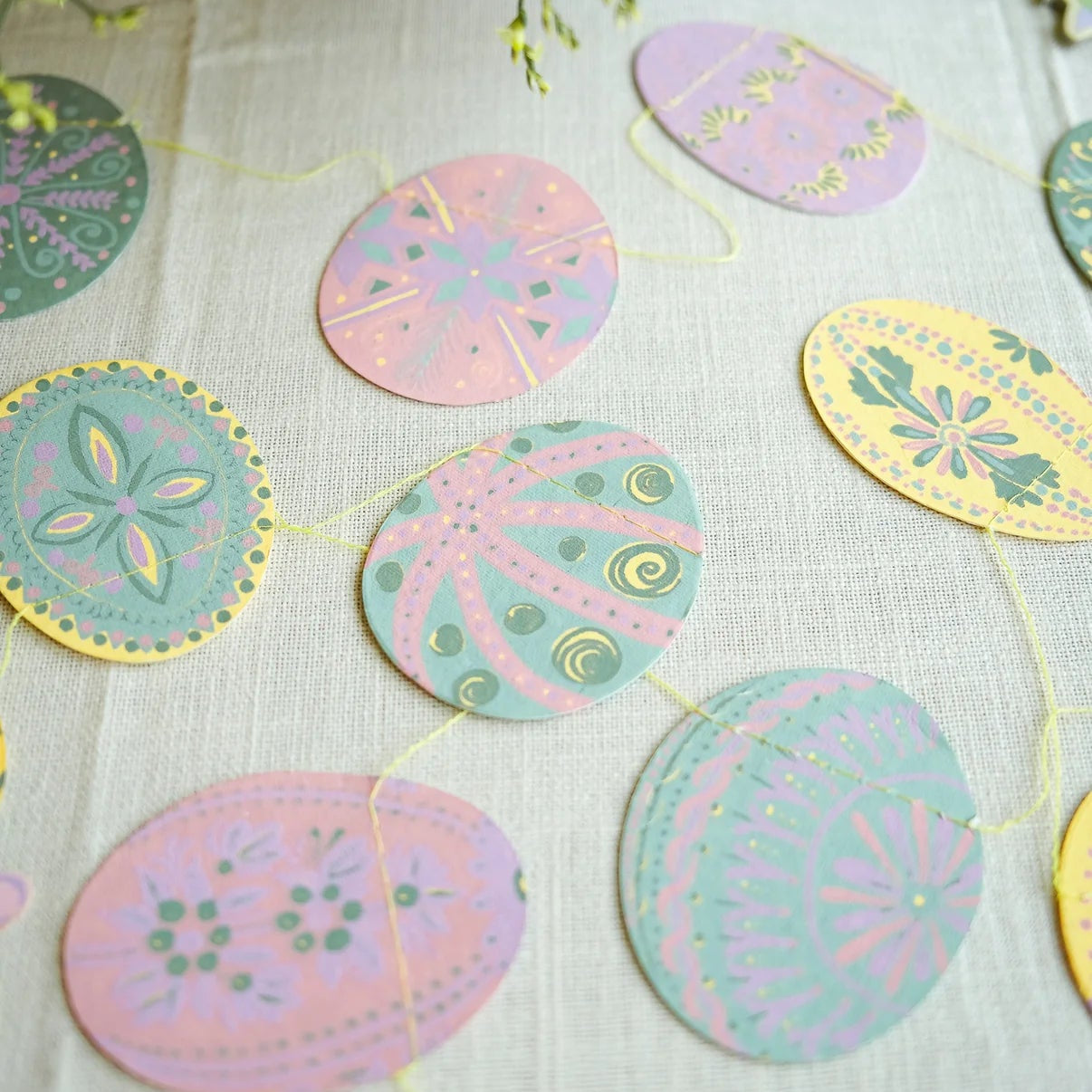 Hand printed paper garland, featuring twenty soft pastel patterned eggs — an Easter delight! Printed on thick, handmade cotton paper; this garland can be stored away and re-used year after year.