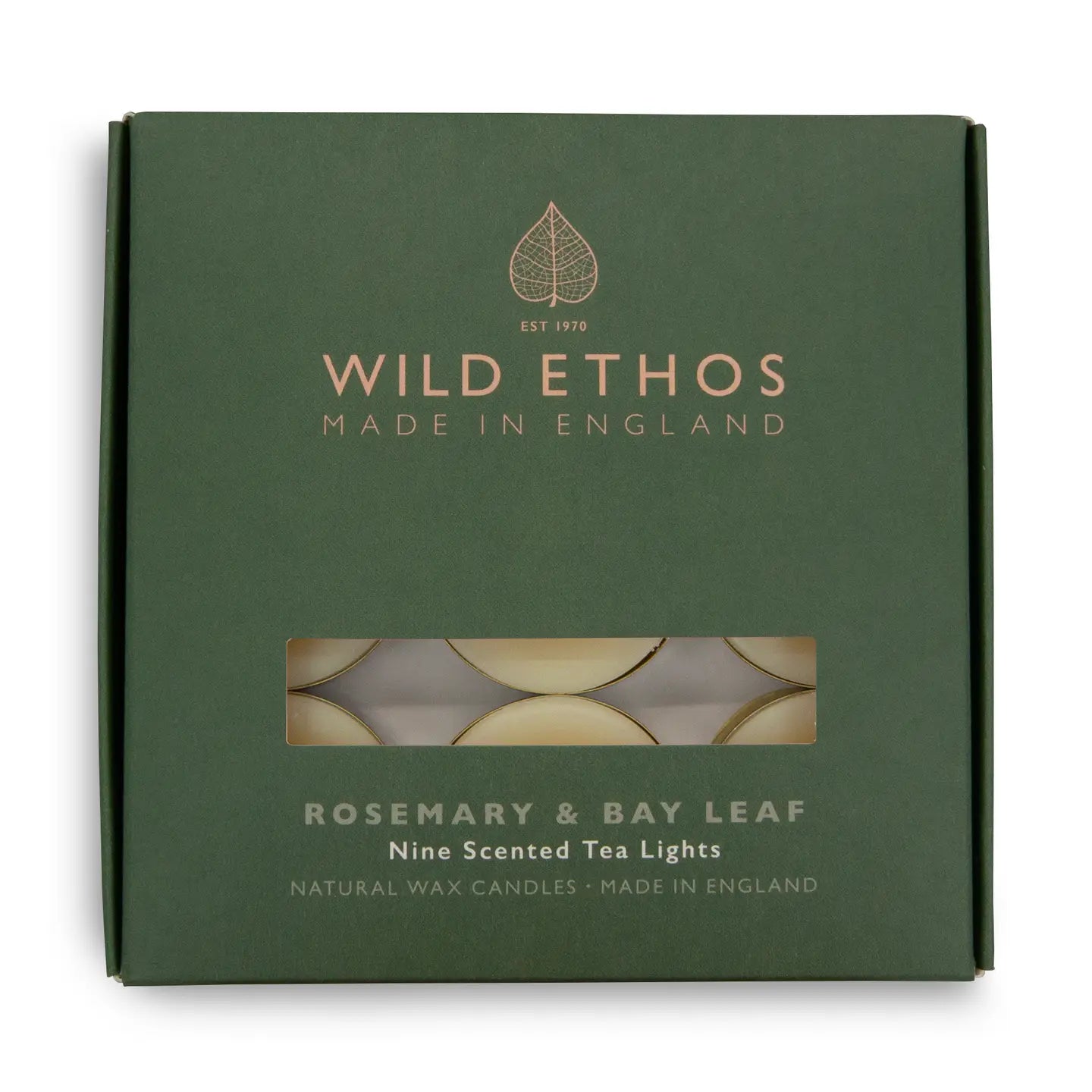 A box of nine rosemary and bay leaf scented tealights, a bestseller from Wild Ethos. A classic herbal mixture of woody rosemary and earthy bay leaves, finished with a touch of eucalyptus and moss — perfect for calming any room in which lit.