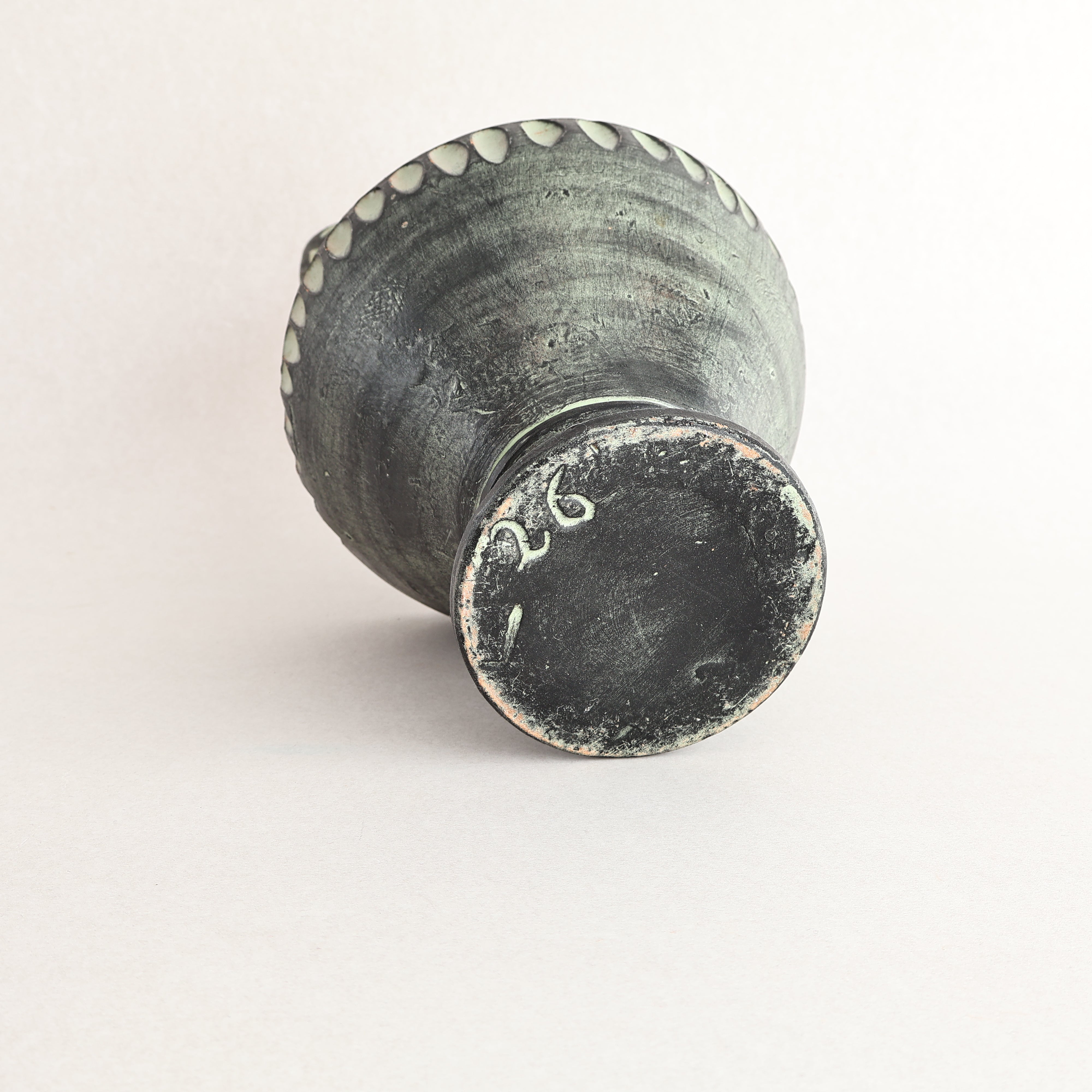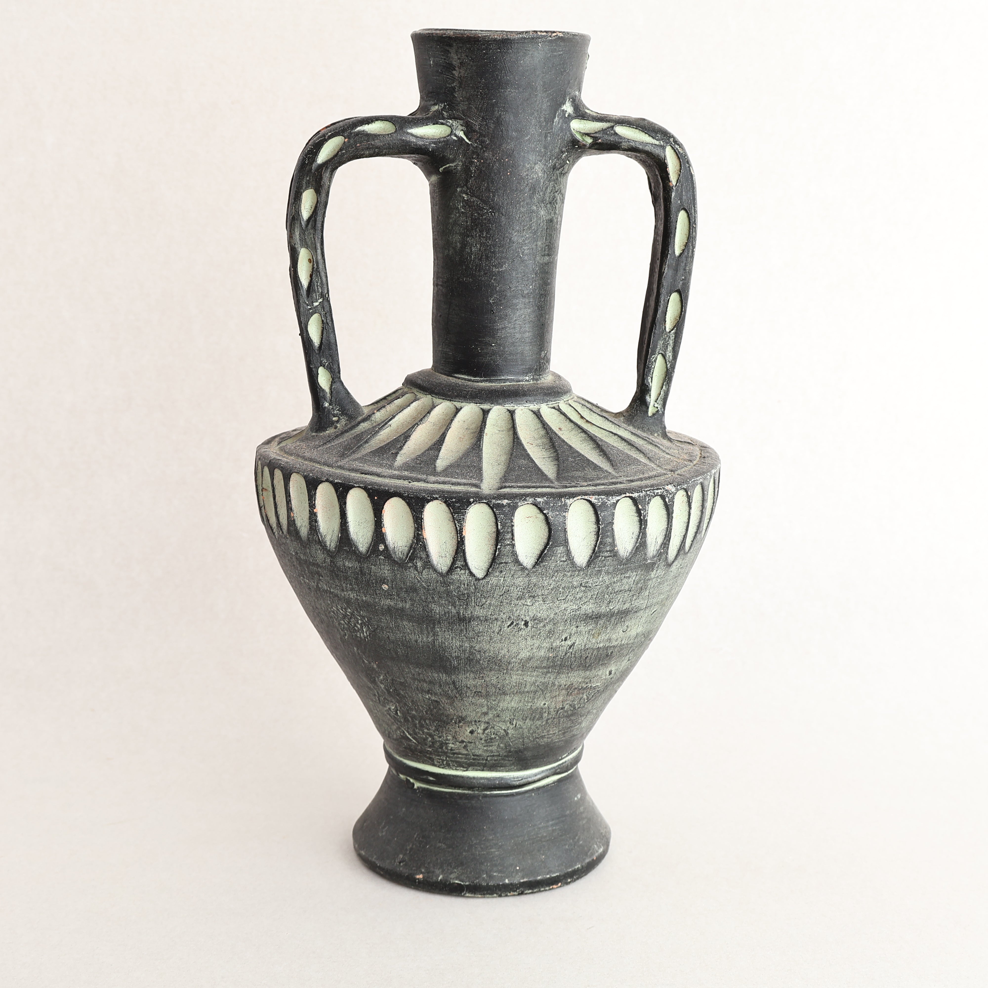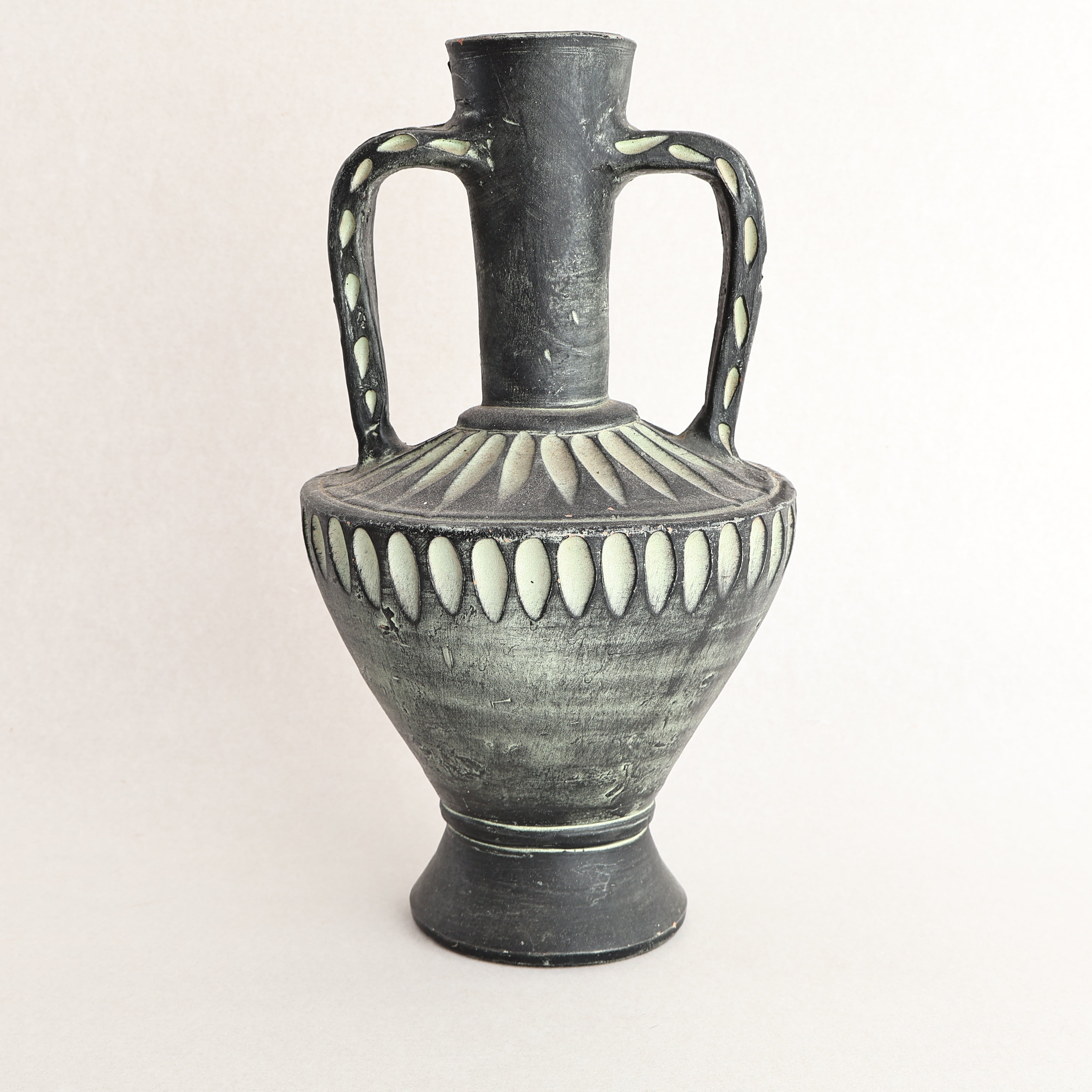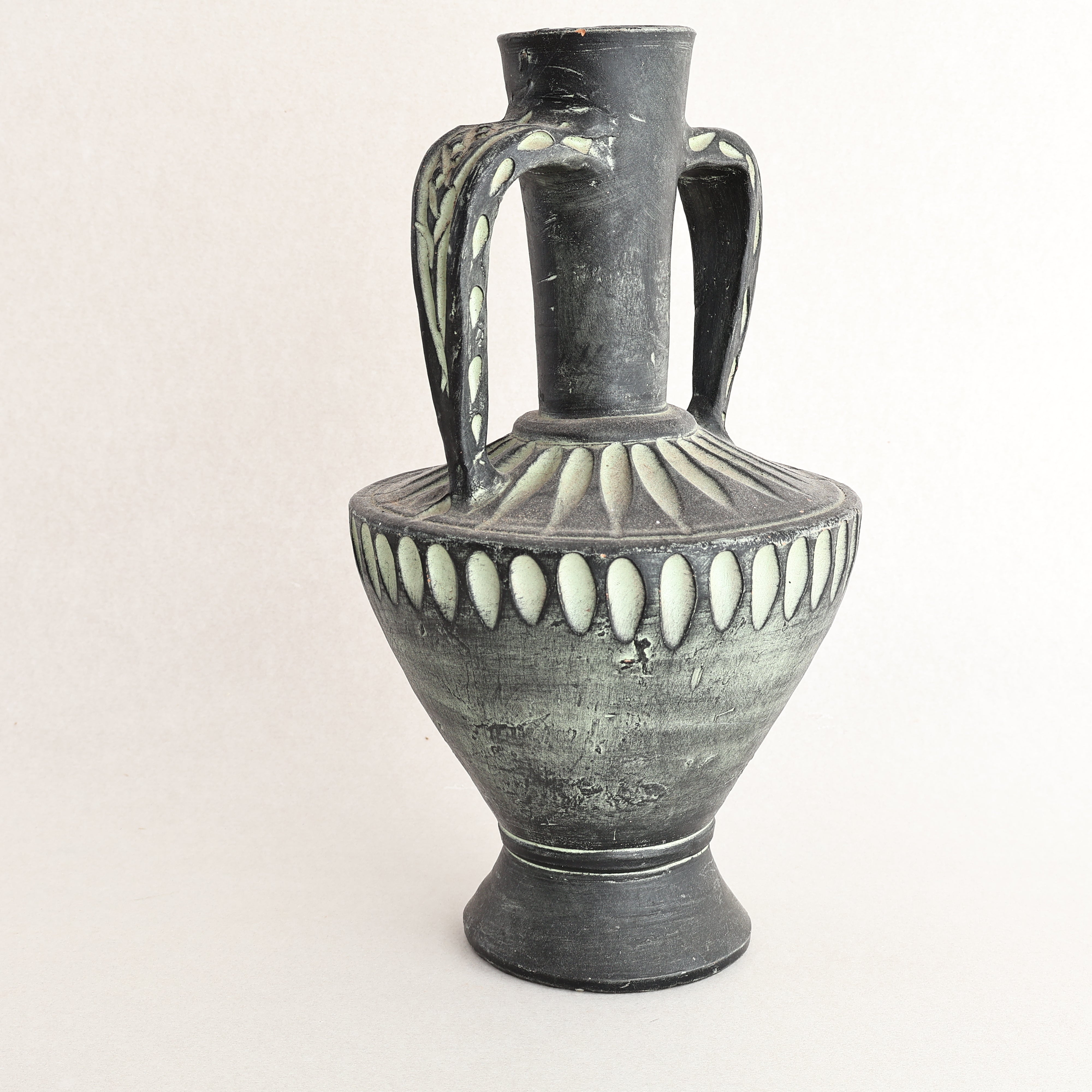 A vintage ceramic brutalist style vase, likely inspired by ancient Greek amphorae or Etruscan bucchero ware.