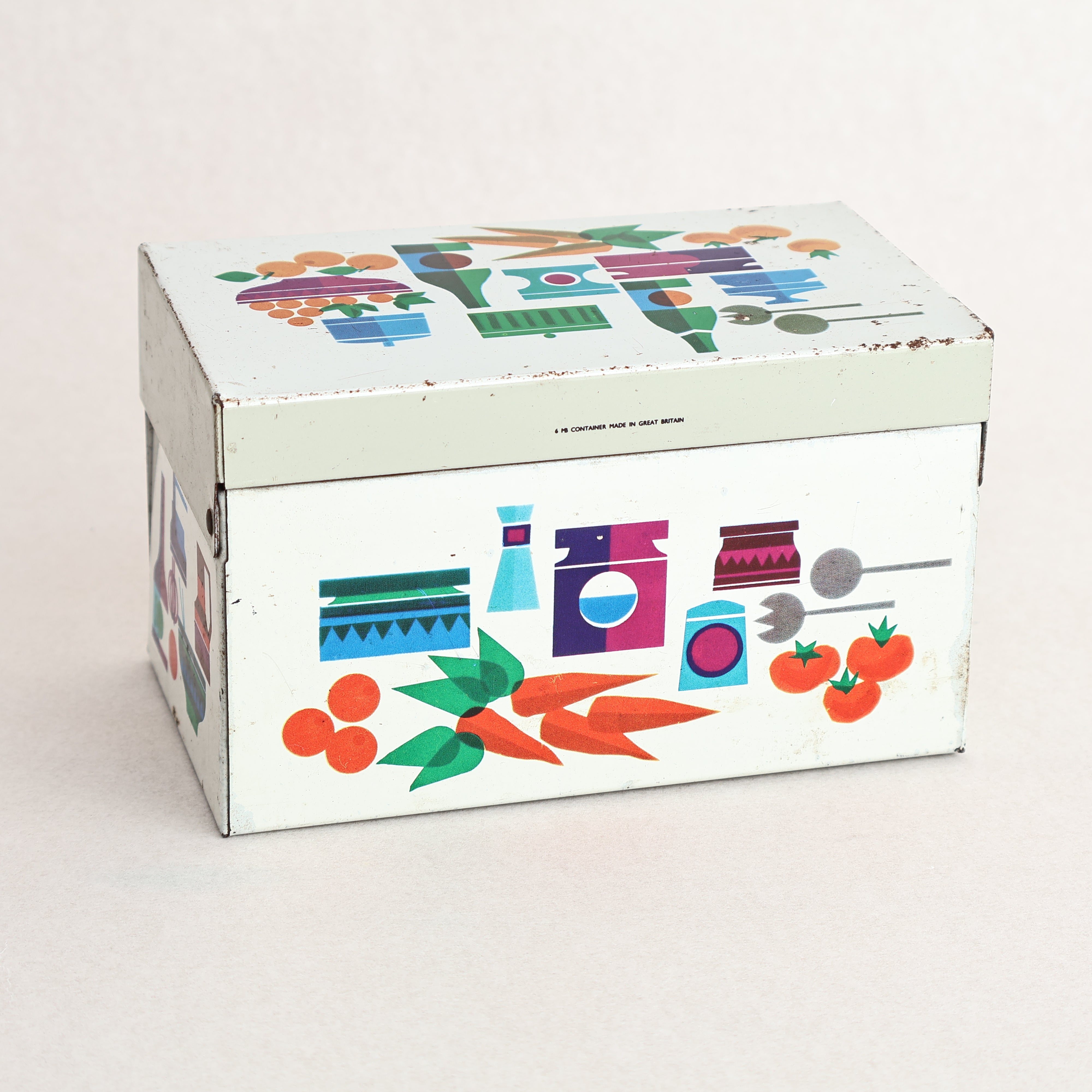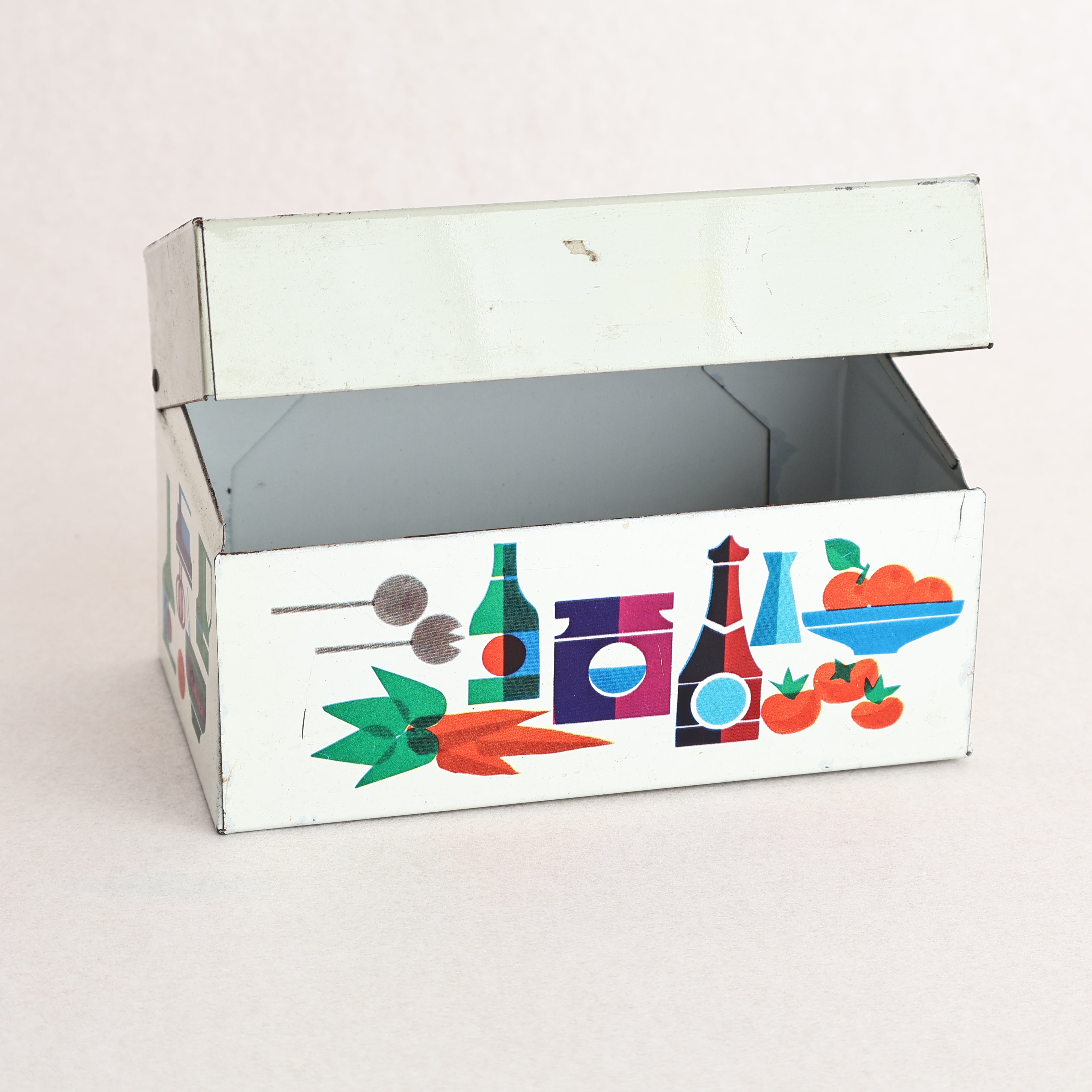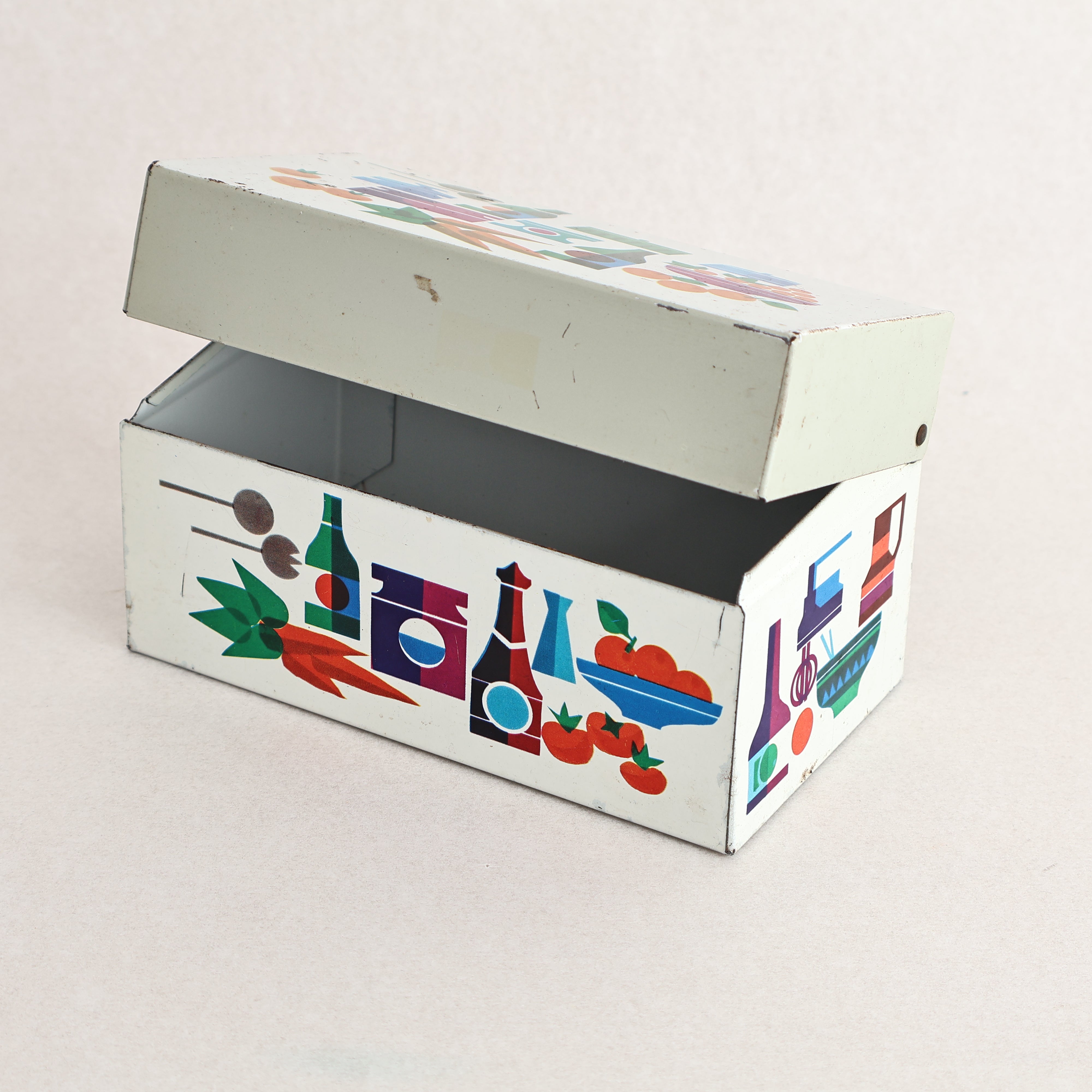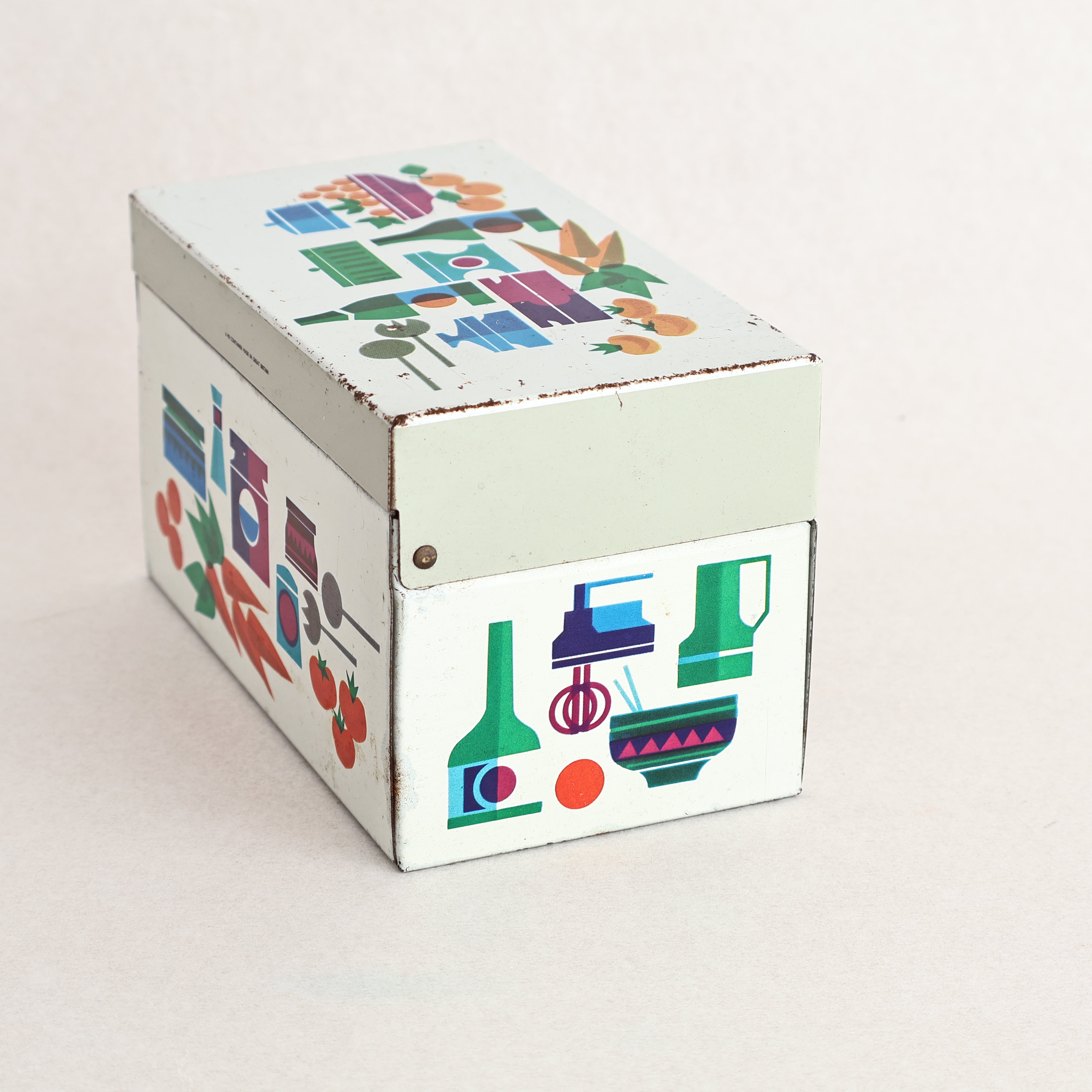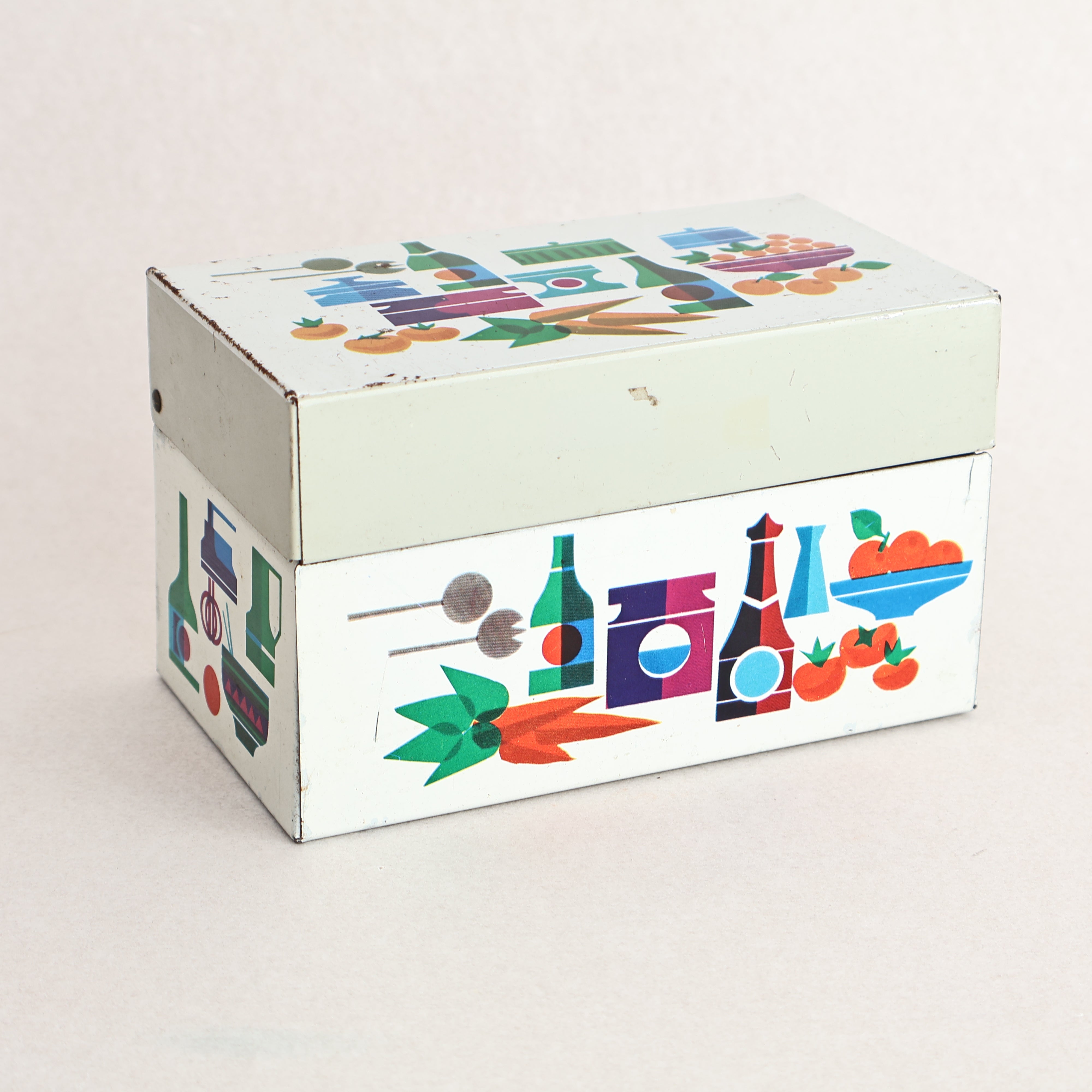 A vintage mid-century recipe card tin or storage box. This lovely little tin features colourful motiphs of fruit, pots and utensils from around the kitchen!